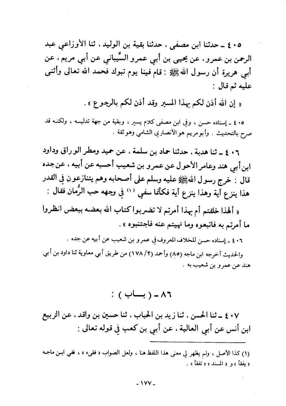406- ثنا هُدْبَةُ حَدَّثَنَا حَمَّادُ بْنُ سَلَمَةَ عَنْ حُمَيْدٍ وَمَطَرٍ الْوَرَّاقِ وداود ابن أبي هند وعامر الأحول عَنْ عَمْرِو بْنِ شُعَيْبٍ أَحْسَبُهُ عَنْ أَبِيهِ عَنْ جَدِّهِ قَالَ: خَرَجَ رَسُولُ اللَّهِ صَلَّى اللَّهُ عَلَيْهِ وسلم عَلَيْهِ وَسَلَّمَ عَلَى أَصْحَابِهِ وَهُمْ يَتَنَازَعُونَ فِي الْقَدَرِ هَذَا يَنْزِعُ آيَةً وَهَذَا يَنْزِعُ آيَةً فَكَأَنَّمَا سفي1 فِي وَجْهِهِ حَبُّ الرُّمَّانِ فَقَالَ: