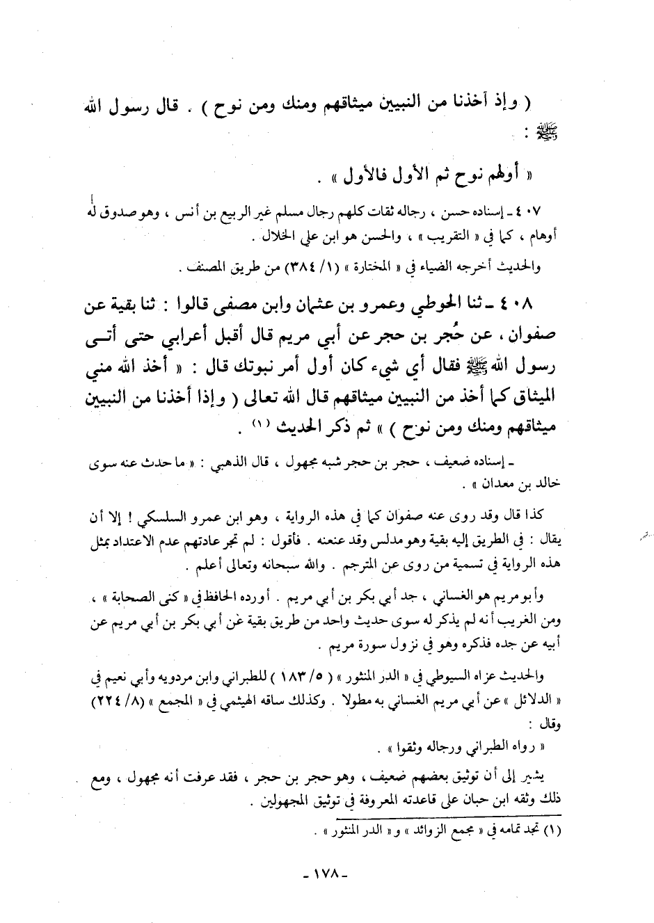 408- ثنا الْحَوْطِيُّ وَعَمْرُو بْنُ عُثْمَانَ وَابْنُ مُصَفَّى قَالُوا: ثنا بَقِيَّةُ عَنْ صَفْوَانَ عَنْ حُجْرِ بْنِ حُجْرٍ عَنْ أَبِي مَرْيَمَ قَالَ: أَقْبَلَ أَعْرَابِيٌّ حَتَّى أَتَى رَسُولَ اللَّهِ صَلَّى اللَّهُ عَلَيْهِ وَسَلَّمَ فَقَالَ: أَيُّ شَيْءٍ كَانَ أَوَّلَ أَمْرِ نُبُوَّتِكَ قَالَ: "أَخَذَ اللَّهُ مِنِّي الْمِيثَاقَ كَمَا أَخَذَ مِنَ النَّبِيِّينَ مِيثَاقَهُمْ" قَالَ اللَّهُ تَعَالَى: {وَإِذْ أَخَذْنَا مِنَ النَّبِيِّينَ مِيثَاقَهُمْ وَمِنْكَ وَمِنْ نُوحٍ} " ثم ذكر الحديث1.