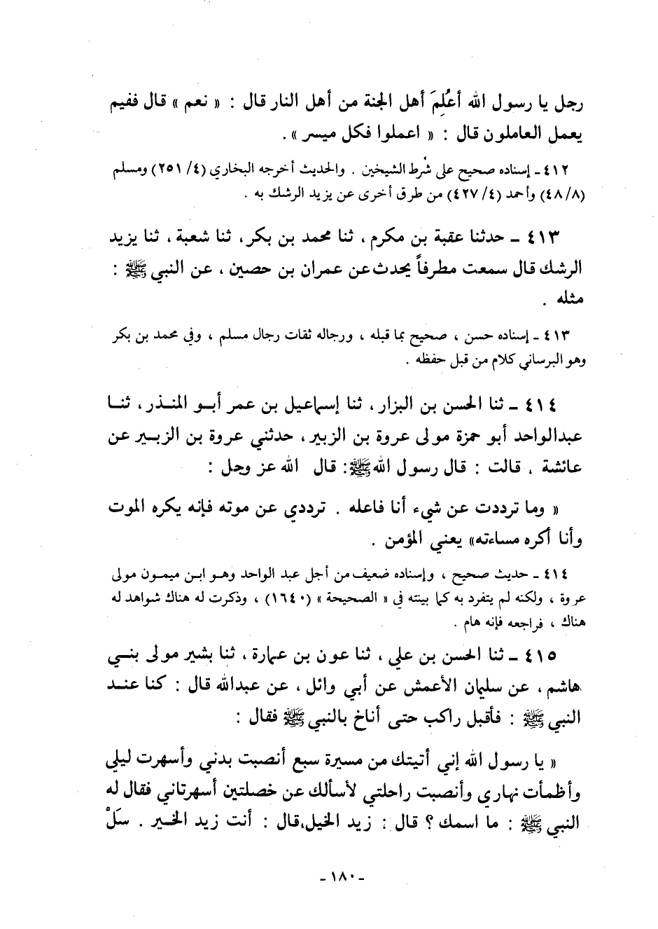 412- حَدَّثَنَا أَبُو بَكْرِ بْنُ أَبِي شَيْبَةَ ثنا إِسْمَاعِيلُ بْنُ عُلَيَّةَ عَنْ يَزِيدَ الرِّشْكِ عَنْ مطرف بن عبد الله ابن الشِّخِّيرِ عَنْ عِمْرَانَ بْنِ حُصَيْنٍ قَالَ: قَالَ رَجُلٌ: يَا رَسُولَ اللَّهِ أَعُلِمَ أَهْلُ الْجَنَّةِ مِنْ أَهْلِ النَّارِ قَالَ: "نَعَمْ" قَالَ: ففيم يعمل العاملون قال: "اعلموا فكل ميسر".