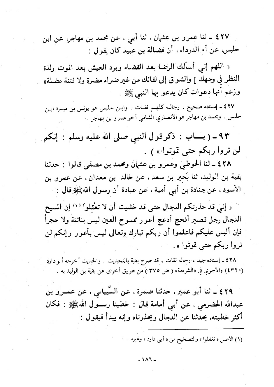427- ثنا عَمْرُو بْنُ عُثْمَانَ ثنا أَبِي عَنْ مُحَمَّدِ بْنِ مُهَاجِرٍ عَنِ ابْنِ حَلْبَسٍ عَنْ أُمِّ الدرداء أن فضالة ابن عُبَيْدٍ كَانَ يَقُولُ: