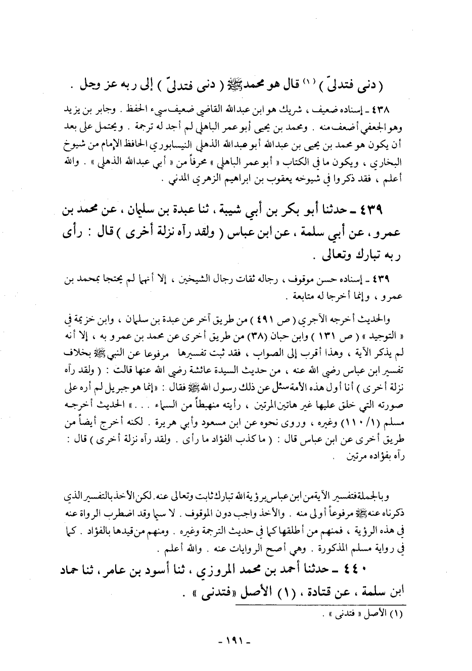 439- حَدَّثَنَا أَبُو بَكْرِ بْنُ أَبِي شَيْبَةَ ثنا عَبْدَةُ بْنُ سُلَيْمَانَ عَنْ مُحَمَّدِ بْنِ عَمْرٍو عَنْ أَبِي سَلَمَةَ عَنِ ابْنِ عَبَّاسٍ {وَلَقَدْ رَآهُ نَزْلَةً أُخْرَى} قَالَ: رأى ربه تبارك وتعالى.