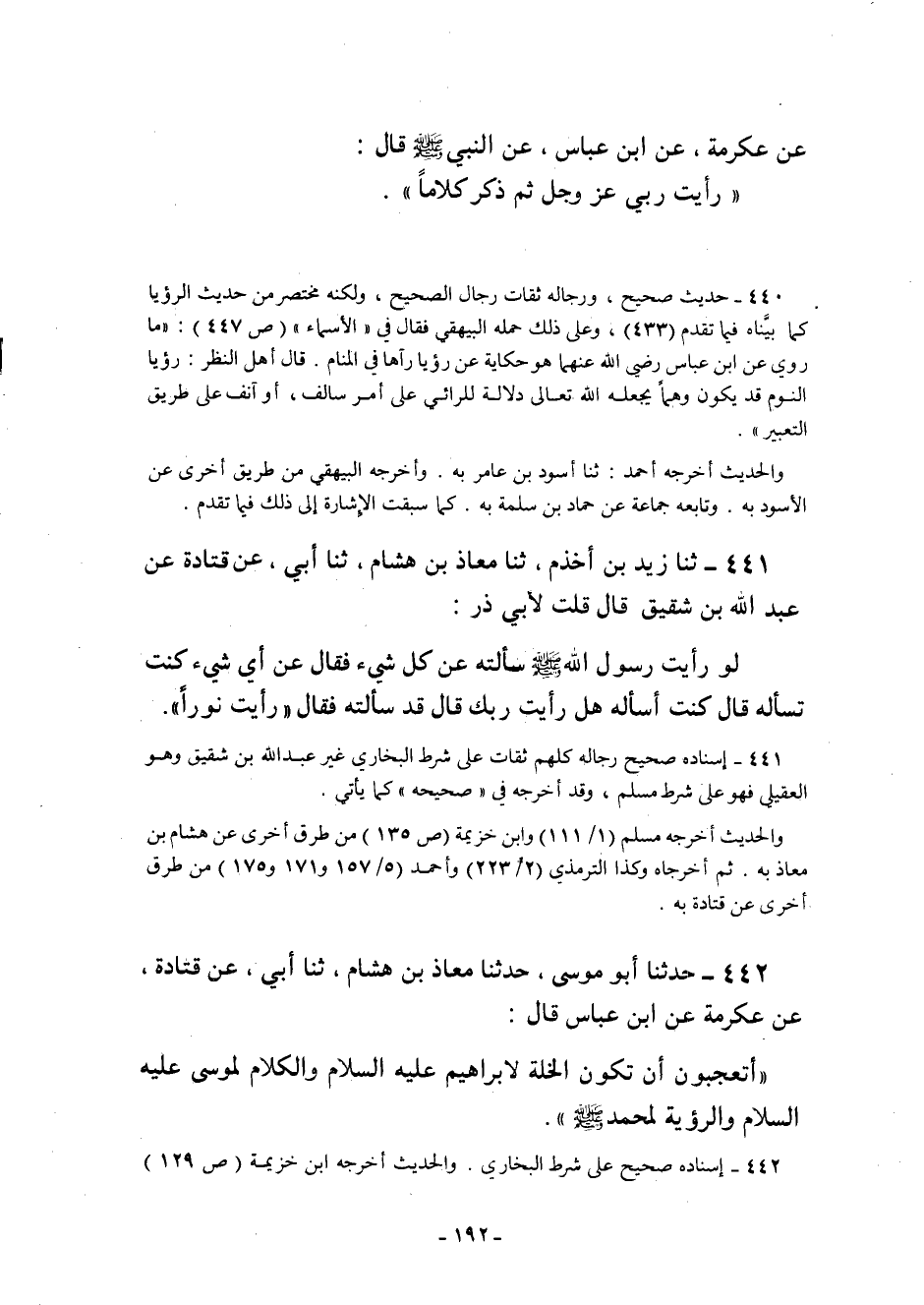 440- حديث صحيح ورجاله ثقات رجال الصحيح ولكنه مختصر من حديث الرؤيا كما بيناه فيما تقدم 433 وعلى ذلك حمله البيهقي فقال في "الأسماء" ص 447: ما روي عن ابن عباس رضي الله عنهما هو حكاية عن رؤيا رآها في المنام. قال أهل النظر: رؤيا النوم قد يكون وهما يجعله الله تعالى دلالة للرائي على أمر سالف أو آنف على طريق التعبير.