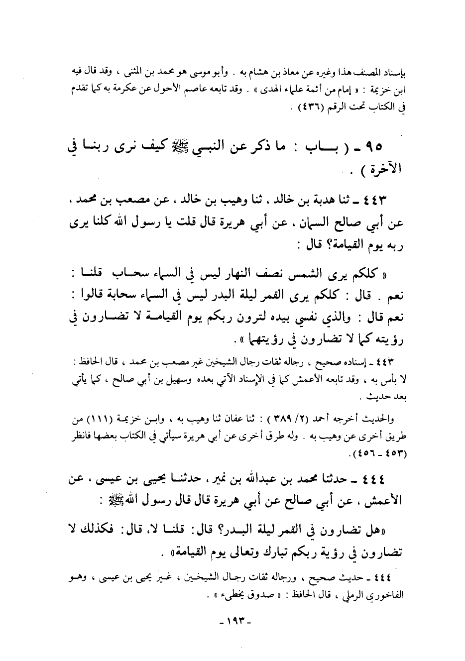 443 - ثنا هُدْبَةُ بْنُ خَالِدٍ ثنا وُهَيْبُ بْنُ خَالِدٍ عَنْ مُصْعَبِ بْنِ مُحَمَّدٍ عَنْ أَبِي صَالِحٍ السَّمَّانِ عَنْ أَبِي هُرَيْرَةَ قَالَ: قُلْتُ: يَا رَسُولَ اللَّهِ كُلُّنَا يَرَى رَبَّهُ يَوْمَ الْقِيَامَةِ؟ قَالَ: