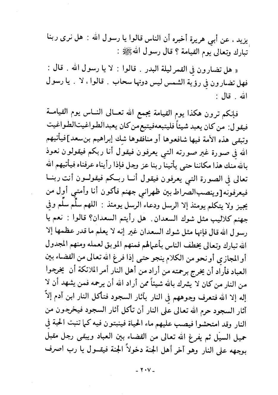 "فإنكم ترون هَكَذَا يَوْمَ الْقِيَامَةِ يَجْمَعُ اللَّهُ تَعَالَى النَّاسَ يَوْمَ الْقِيَامَةِ فَيَقُولُ: مَنْ كَانَ يَعْبُدُ شَيْئًا فَلْيَتَّبِعْهُ فَيَتَّبِعُ مَنْ كَانَ يَعْبُدُ الطَّوَاغِيتَ الطَّوَاغِيتَ وَتَبْقَى هَذِهِ الأُمَّةُ فِيهَا شَافِعُوهَا أَوْ مُنَافِقُوهَا شَكَّ إِبْرَاهِيمُ بْنُ سَعْدٍ فَيَأْتِيهِمُ اللَّهُ فِي صُورَةٍ غَيْرِ صُورَتِهِ الَّتِي يَعْرِفُونَ فَيَقُولُ: أَنَا رَبُّكُمْ فَيَقُولُونَ: نَعُوذُ بِاللَّهِ مِنْكَ هَذَا مَكَانُنَا حَتَّى يَأْتِيَنَا رَبُّنَا عَزَّ وَجَلَّ فَإِذَا رَأَيْنَاهُ عَرَفْنَاهُ فَيَأْتِيهِمُ اللَّهُ تَعَالَى فِي الصُّورَةِ الَّتِي يَعْرِفُونَ فَيَقُولُ أَنَا رَبُّكُمْ فَيَقُولُونَ أَنْتَ رَبُّنَا فَيَعْرِفُونَهُ وَيُنْصَبُ الصِّرَاطُ بَيْنَ ظَهْرَانَيْ جَهَنَّمَ فَأَكُونُ أَنَا وَأُمَّتِي أَوَّلَ مَنْ يُجِيزُ وَلا يَتَكَلَّمُ يَوْمَئِذٍ إِلا الرُّسُلُ وَدُعَاءُ الرُّسُلِ يَوْمَئِذٍ: اللَّهُمَّ سَلِّمْ سَلِّمْ وَفِي جَهَنَّمَ كَلالِيبُ مِثْلُ شَوْكِ السَّعْدَانِ. هَلْ رَأَيْتُمُ السَّعْدَانَ؟ قَالُوا: نَعَمْ يَا رَسُولَ اللَّهِ قَالَ فَإِنَّهَا مِثْلُ شَوْكِ السَّعْدَانِ غَيْرَ إِنَّهُ لا يَعْلَمُ مَا قَدْرَ عِظَمِهَا إِلا الله تبارك وتعالى يخطف النَّاسَ بِأَعْمَالِهِمْ فَمِنْهُمُ الْمُوبَقُ لِعَمَلِهِ وَمِنْهُمُ الْمَجْدُولُ أَوِ الْمُجَازَى أَوْ نَحْوٌ مِنَ الْكَلامِ يَنْجُو حَتَّى إِذَا فَرَغَ اللَّهُ تَعَالَى مِنَ الْقَضَاءِ بَيْنَ الْعِبَادِ فَأَرَادَ أَنْ يُخْرِجَ بِرَحْمَتِهِ مَنْ أَرَادَ مِنْ أَهْلِ النَّارِ أَمَرَ الْمَلائِكَةَ أَنْ يُخْرِجُوا مِنَ النَّارِ مَنْ كَانَ لا يُشْرِكُ بِاللَّهِ شَيْئًا مِمَّنْ أَرَادَ اللَّهُ أَنْ يَرْحَمَهُ فَمَنْ يَشْهَدُ أَنْ لا إِلَهَ إِلا اللَّهُ فَتُعْرَفُ وُجُوهُهُمْ فِي النَّارِ بِآثَارِ السُّجُودِ فَتَأْكُلُ النَّارُ ابْنَ آدَمَ إِلا آثَارَ السُّجُودِ حَرَّمَ اللَّهُ تَعَالَى عَلَى النَّارِ أَنْ تَأْكُلَ آثَارَ السُّجُودِ فَيَخْرُجُونَ مِنَ النَّارِ وَقَدِ امْتَحَشُوا فَيُصَبُّ عَلَيْهِمْ مَاءُ الْحَيَاةِ فَيَنْبُتُونَ فِيهِ كَمَا تَنْبُتُ الْحَبَّةُ فِي حَمِيلِ السَّيْلِ ثُمَّ يَفْرُغُ اللَّهُ تَعَالَى مِنَ الْقَضَاءِ بَيْنَ الْعِبَادِ وَيَبْقَى رَجُلٌ مُقْبِلٌ بِوَجْهِهِ عَلَى النَّارِ وَهُوَ آخِرُ أَهْلِ الْجَنَّةِ دُخُولا الْجَنَّةَ فَيَقُولُ يَا رَبِّ اصْرِفْ