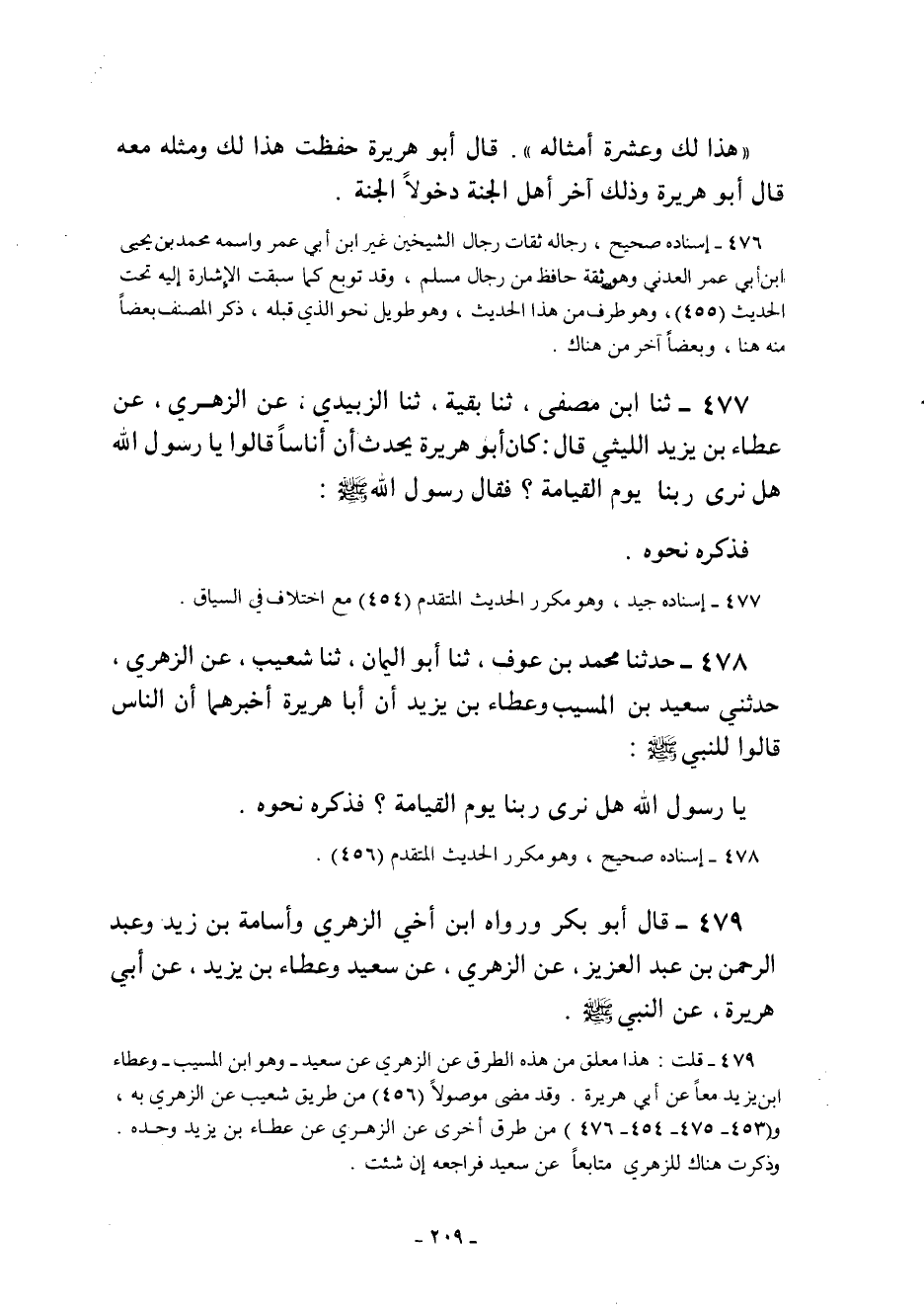 477 - ثنا ابْنُ مُصَفَى ثنا بَقِيَّةُ ثنا الزُّبَيْدِيُّ عَنِ الزُّهْرِيِّ عَنْ عَطَاءِ بْنِ يَزِيدَ اللَّيْثِيِّ قَالَ: كَانَ أَبُو هُرَيْرَةَ يُحَدِّثُ أَنَّ أُنَاسًا قَالُوا يَا رَسُولَ اللَّهِ: هَلْ نَرَى رَبَّنَا يَوْمَ الْقِيَامَةِ؟ فَقَالَ رَسُولُ اللَّهِ صَلَّى اللَّهُ عليه وسلم: