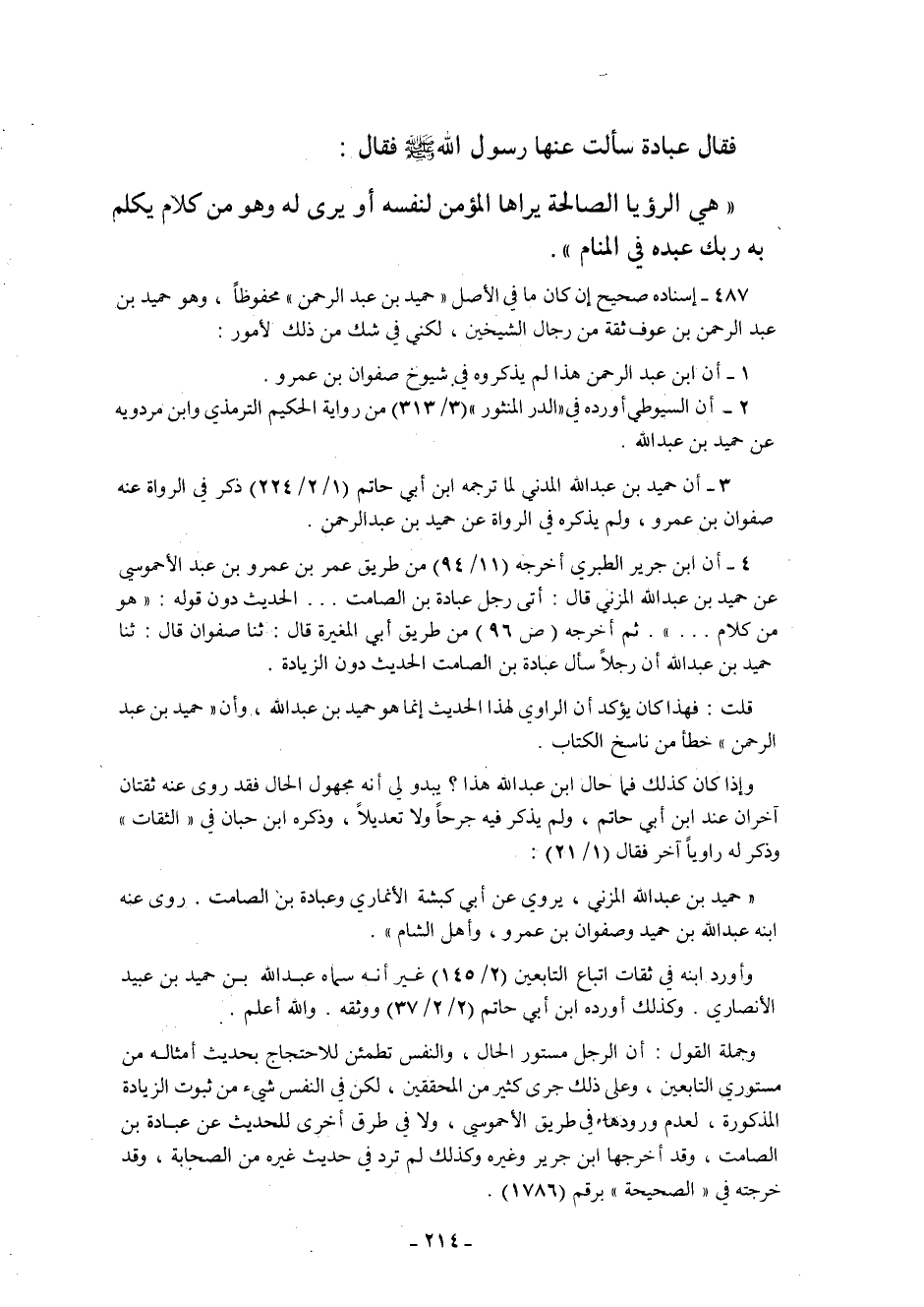 قلت: فهذا كان يؤكد أن الراوي لهذا الحديث إنما هو حميد بن عبد الله وأن حميد بن عبد الرحمن خطأ من ناسخ الكتاب.