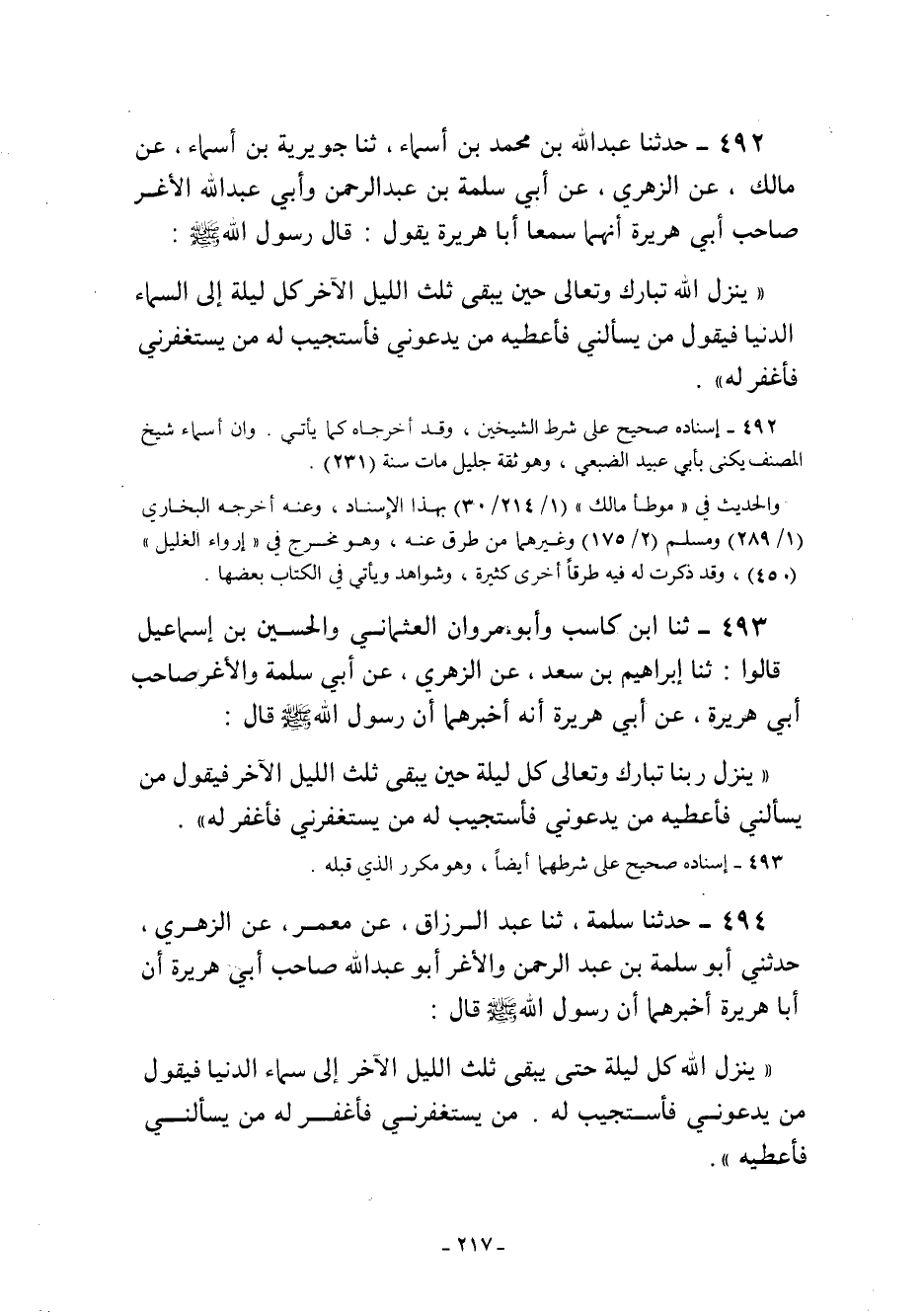 "يَنْزِلُ اللَّهُ كُلَّ لَيْلَةٍ حَتَّى يَبْقَى ثُلُثُ اللَّيْلِ الآخِرُ إِلَى سَمَاءِ الدُّنْيَا فَيَقُولُ مَنْ يَدْعُونِي فَأَسْتَجِيبَ لَهُ. مَنْ يَسْتَغْفِرُنِي فَأَغْفِرَ له من يسألني فأعطيه".