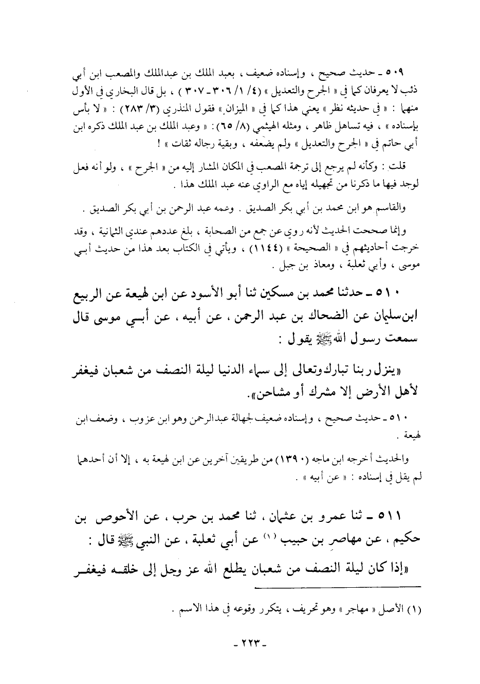 قلت: وكأنه لم يرجع إلى ترجمة المصعب في المكان المشار إليه من "الجرح" ولو أنه فعل لوجد فيها ما ذكرنا من تجهيله إياه مع الراوي عند عبد الملك هذا.