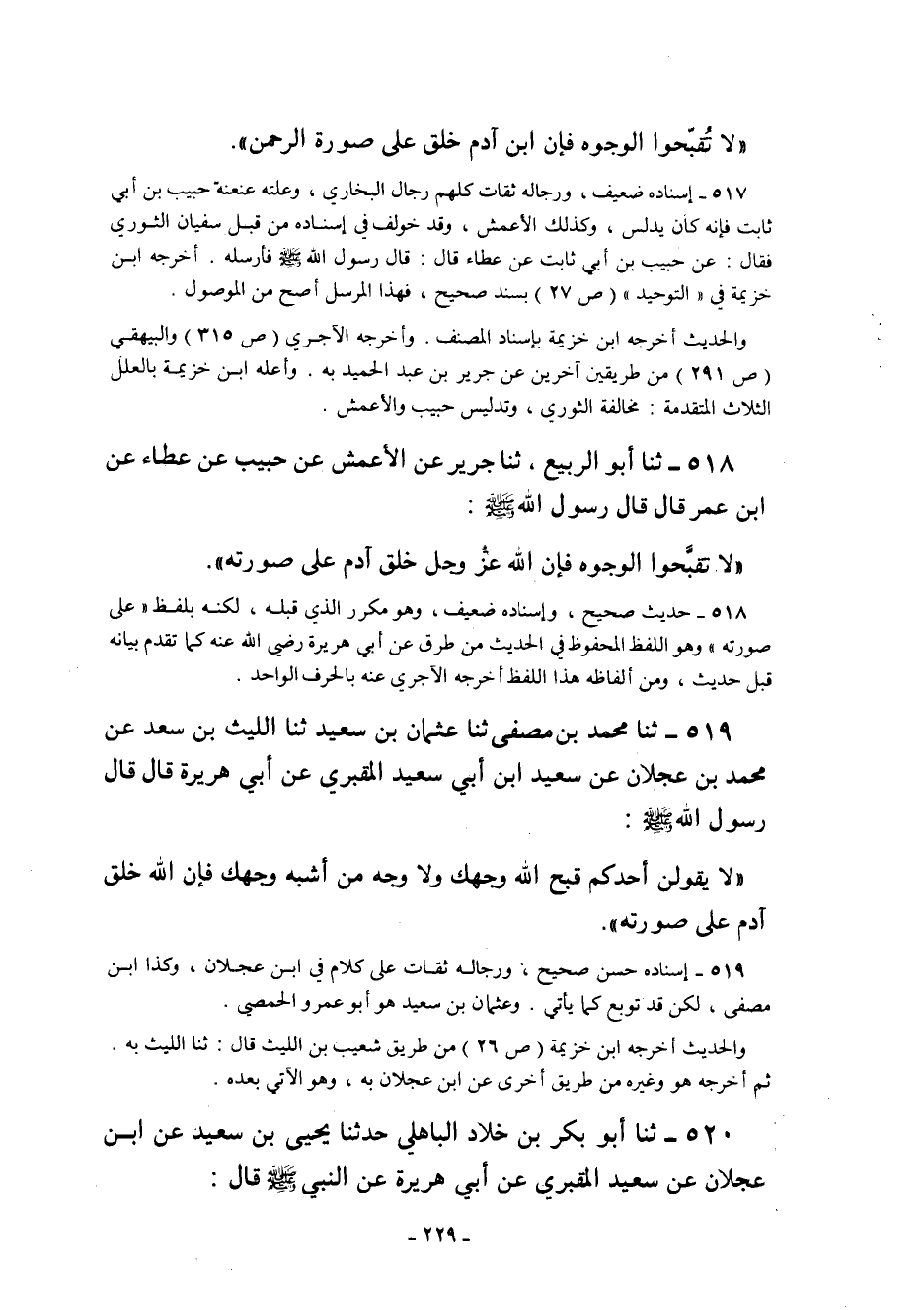 "لا يَقُولَنَّ أَحَدُكُمْ قَبَّحَ اللَّهُ وَجْهَكَ وَلا وَجْهَ مَنْ أَشْبَهَ وَجْهَكَ فَإِنَّ اللَّهَ خَلَقَ آدَمَ عَلَى صورته".