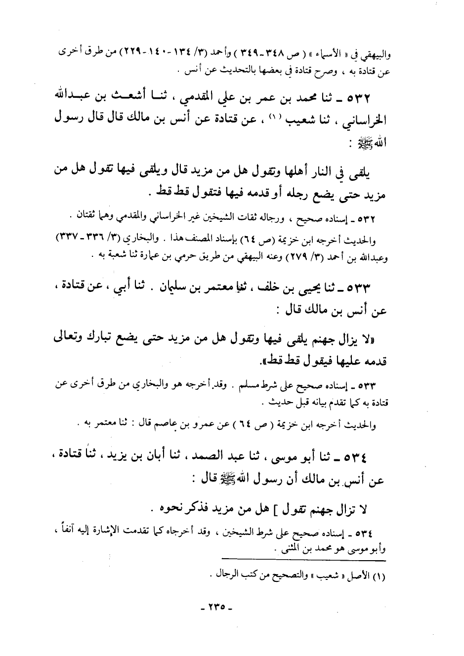 533 - ثنا يَحْيَى بْنُ خَلَفٍ ثنا مُعْتَمِرُ بْنُ سُلَيْمَانَ. ثنا أَبِي عَنْ قَتَادَةَ عَنْ أَنَسِ بْنِ مَالِكٍ قَالَ: