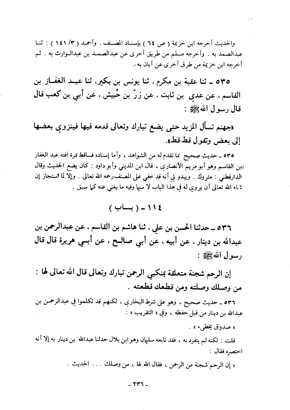 "باب" حديث: "إِنَّ الرَّحِمَ شَجْنَةٌ مُتَعَلِّقَةٌ بِمَنْكِبَيِ الرحمن ... "