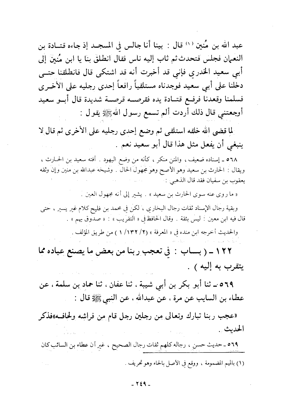 "لَمَّا قَضَى اللَّهُ خَلْقَهُ اسْتَلْقَى ثُمَّ وَضَعَ إِحْدَى رِجْلَيْهِ عَلَى الأُخْرَى ثُمَّ قَالَ لا يَنْبَغِي أَنْ يُفْعَلَ مِثْلُ هَذَا" قَالَ أَبُو سَعِيدٍ نعم.