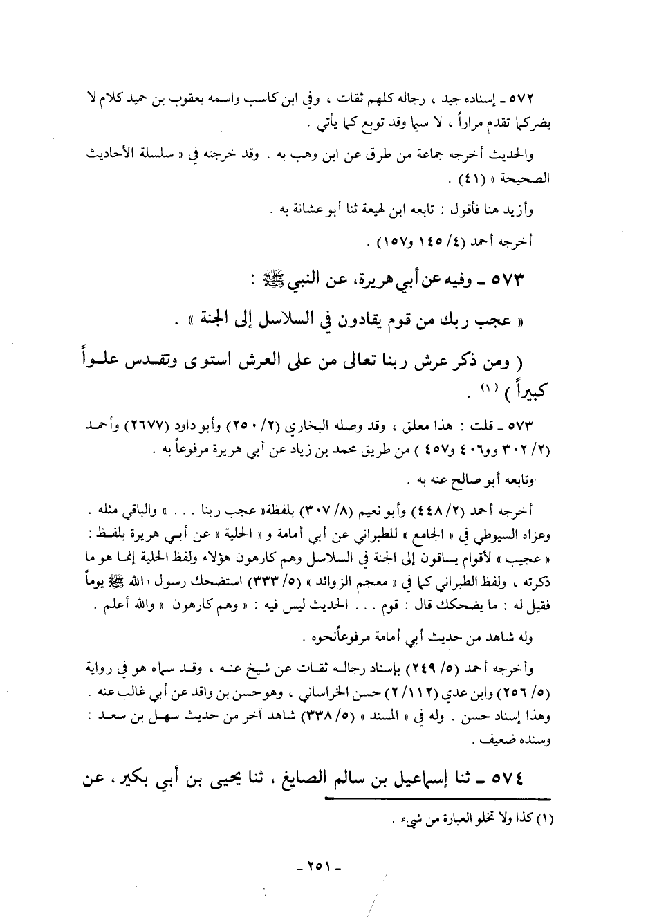 أخرجه أحمد 2/448 وأبو نعيم 8/307 بلفظة عجب ربنا والباقي مثله. وعزاه السيوطي في "الجامع" للطبراني عن أبي أمامة و"الحلية" عن أبي هريرة بلفظ: عجيب لأقوام يساقون إلى الجنة في السلاسل وهم كارهون ولفظ الحلية إنما هو ما ذكرته ولفظ الطبراني كما في "معجم الزوائد" 5/333 استضحك رَسُولُ اللَّهِ صَلَّى اللَّهُ عَلَيْهِ وسلم يوما فقيل له: ما يضحكك قال: "قوم ... " الحديث ليس فيه: وهم كارهون والله أعلم.