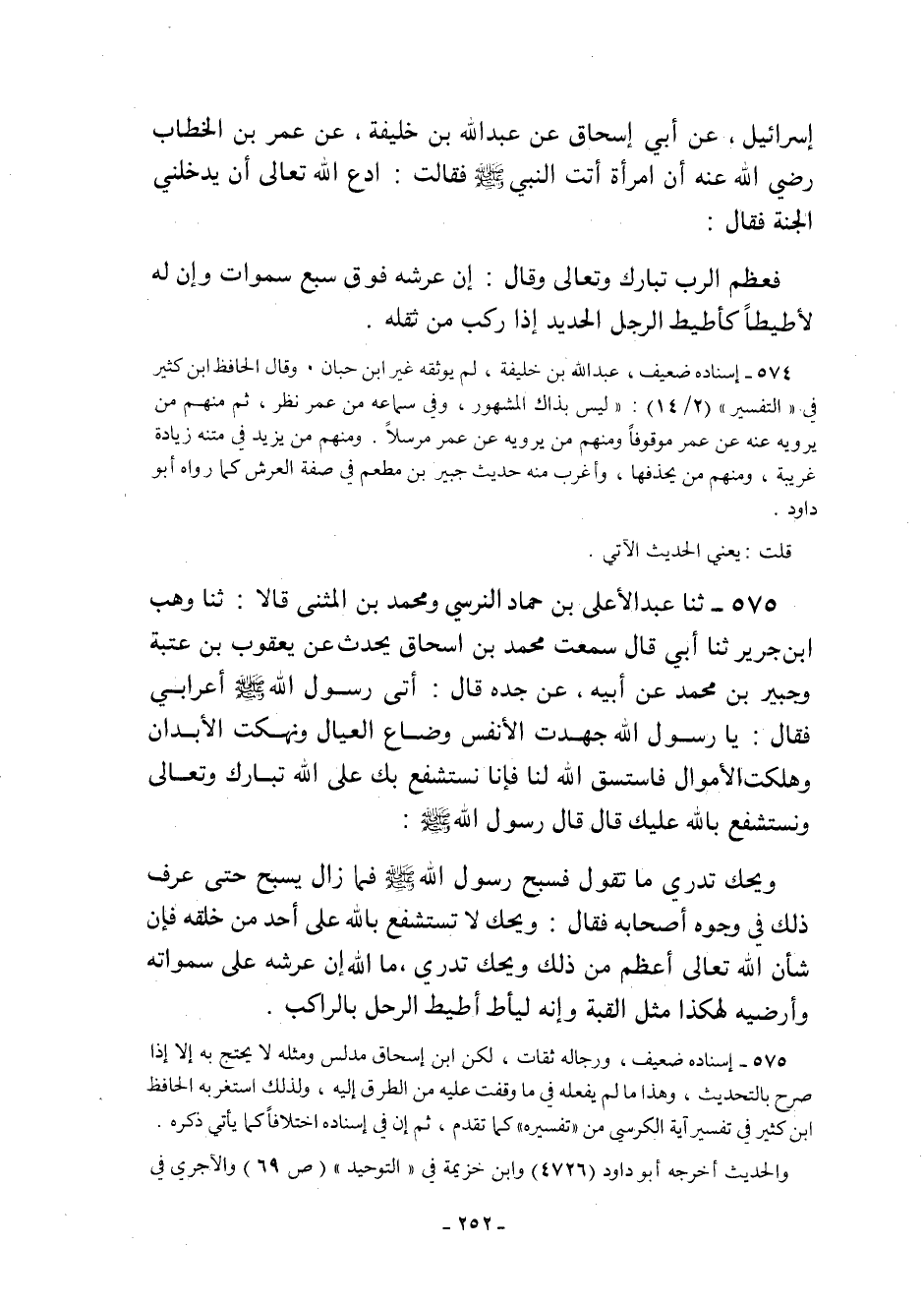 575 - ثنا عَبْدُ الأَعْلَى بْنُ حَمَّادٍ النَّرْسِيُّ وَمُحَمَّدُ بْنُ الْمُثَنَّى قَالا: ثنا وهب ابن جَرِيرٍ ثنا أَبِي قَالَ سَمِعْتُ مُحَمَّدَ بْنَ إِسْحَاقَ يُحَدِّثُ عَنْ يعقوب بن عتبة وجبير بْنِ مُحَمَّدٍ عَنْ أَبِيهِ عَنْ جَدِّهِ قَالَ: أَتَى رَسُولَ اللَّهِ صَلَّى اللَّهُ عَلَيْهِ وَسَلَّمَ أَعْرَابِيٌّ فَقَالَ يَا رَسُولَ اللَّهِ: جُهِدَتِ الأَنْفُسُ وَضَاعَ الْعِيَالُ وَنُهِكَتِ الأَبْدَانُ وَهَلَكَتِ الأَمْوَالُ فَاسْتَسْقِ اللَّهَ لَنَا فَإِنَّا نَسْتَشْفِعُ بِكَ عَلَى اللَّهِ تَبَارَكَ وَتَعَالَى وَنَسْتَشْفِعُ بِاللَّهِ عَلَيْكَ قَالَ: قَالَ رَسُولُ اللَّهِ صَلَّى اللَّهُ عَلَيْهِ وَسَلَّمَ:
