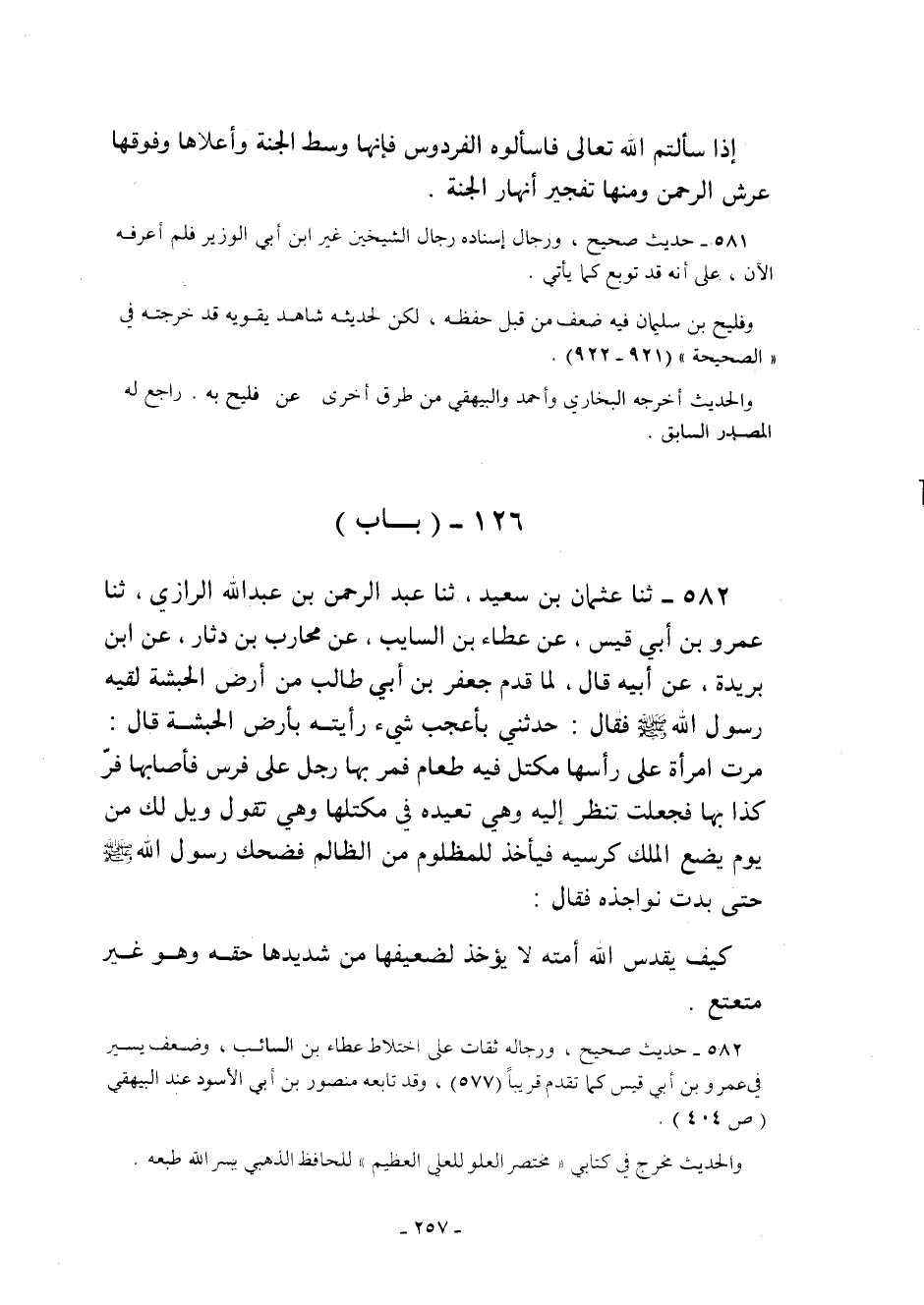 582- ثنا عُثْمَانُ بْنُ سَعِيدٍ ثنا عَبْدُ الرَّحْمَنِ بْنُ عَبْدِ اللَّهِ الرَّازِيُّ ثنا عَمْرُو بْنُ أبي قيس عن عطاء ابن السايب عَنْ مُحَارِبِ بْنِ دِثَارٍ عَنِ ابْنِ بُرَيْدَةَ عَنْ أَبِيهِ قَالَ لَمَّا قَدِمَ جَعْفَرُ بْنُ أَبِي طَالِبٍ مِنْ أَرْضِ الْحَبَشَةِ لَقِيَهُ رَسُولُ اللَّهِ صَلَّى اللَّهُ عَلَيْهِ وَسَلَّمَ فَقَالَ: "حَدِّثْنِي بِأَعْجَبِ شَيْءٍ رَأَيْتَهُ بِأَرْضِ الْحَبَشَةِ" قَالَ مَرَّتِ امْرَأَةٌ عَلَى رَأْسِهَا مِكْتَلٌ فِيهِ طَعَامٌ فَمَرَّ بِهَا رَجُلٌ عَلَى فرس فأصابها فر كذا بِهَا فَجَعَلَتْ تَنْظُرُ إِلَيْهِ وَهِيَ تُعِيدُهُ فِي مِكْتَلِهَا وَهِيَ تَقُولُ وَيْلٌ لَكَ مِنْ يَوْمٍ يَضَعُ الْمَلِكُ كُرْسِيَّهُ فَيَأْخُذَ لِلْمَظْلُومِ مِنَ الظَّالِمِ فَضَحِكَ رَسُولُ اللَّهِ صَلَّى اللَّهُ عَلَيْهِ وَسَلَّمَ حَتَّى بَدَتْ نَوَاجِذُهُ فَقَالَ: