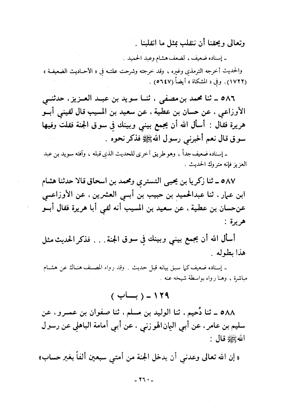 586 - ثنا مُحَمَّدُ بْنُ مُصَفَّى ثنا سُوَيْدُ بْنُ عَبْدِ الْعَزِيزِ حَدَّثَنِي الأَوْزَاعِيِّ عَنْ حَسَّانَ بْنِ عَطِيَّةَ عَنْ سَعِيدِ بْنِ الْمُسَيِّبِ قَالَ لقيني أبوهريرة فَقَالَ: أَسْأَلُ اللَّهَ أَنْ يَجْمَعَ بَيْنِي وَبَيْنَكَ فِي سُوقِ الْجَنَّةِ فَقُلْتُ وَفِيهَا سُوقٌ قَالَ نَعَمْ أَخْبَرَنِي رَسُولُ اللَّهِ صَلَّى اللَّهُ عليه وسلم فذكر نحوه.