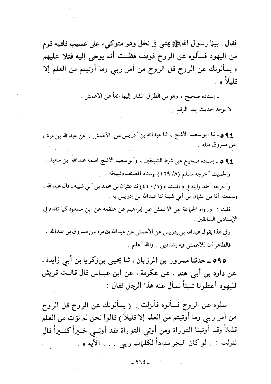 595 - حَدَّثَنَا مَسْرُورُ بْنُ الْمَرْزُبَانِ ثنا يَحْيَى بْنُ زَكَرِيَّا بْنِ أَبِي زايدة عَنْ دَاوُدَ بْنِ أَبِي هِنْدَ عَنْ عِكْرِمَةَ عَنِ ابْنِ عَبَّاسٍ قَالَ: قَالَتْ قُرَيْشٌ لِلْيَهُودِ: أَعْطُونَا شَيْئًا نَسْأَلْ عَنْهُ هَذَا الرَّجُلَ فقال: