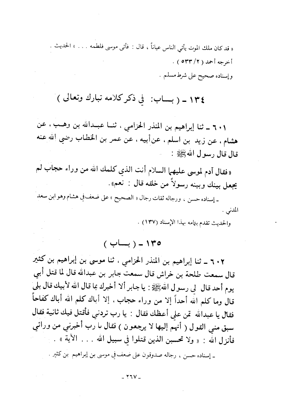 602 - ثنا إِبْرَاهِيمُ بْنُ الْمُنْذِرِ الْحِزَامِيُّ ثنا مُوسَى بْنُ إِبْرَاهِيمَ بْنِ كَثِيرٍ قَالَ سَمِعْتُ طَلْحَةَ بْنَ خِرَاشٍ قَالَ سَمِعْتُ جَابِرَ بْنَ عَبْدِ اللَّهِ قَالَ لَمَّا قُتِلَ أَبِي يَوْمَ أُحُدٍ قَالَ لِي رَسُولُ اللَّهِ صَلَّى اللَّهُ عَلَيْهِ وَسَلَّمَ: "يَا جَابِرُ أَلا أُخْبِرُكَ بِمَا قَالَ اللَّهُ لأبِيكَ" قال: بلى, قال: "وماكلم اللَّهُ أَحَدًا إِلا مِنْ وَرَاءِ حِجَابٍ إِلا أَبَاكَ كَلَّمَ اللَّهُ أَبَاكَ كِفَاحًا فَقَالَ: يَا عَبْدَ الله تمن علي أعظك فَقَالَ: يَا رَبِّ تَرُدُّنِي فَأُقْتَلُ فِيكَ ثَانِيَةً, فَقَالَ: سَبَقَ مِنِّي القول أنهم إليها لا يَرْجِعُونَ فَقَالَ: يَا رَبِّ أَخْبِرْنِي مَنْ وَرَائِي فَأَنْزَلَ اللَّهُ: {وَلا تَحْسَبَنَّ الَّذِينَ قُتِلُوا فِي سَبِيلِ اللَّهِ ... } الآية.