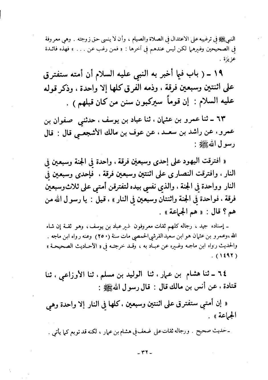 "افْتَرَقَتِ الْيَهُودُ عَلَى إِحْدَى وَسَبْعِينَ فِرْقَةً واحدة في الجنة وسبعين فِي النَّارِ وَافْتَرَقَتِ النَّصَارَى عَلَى اثنتين وسبعين فرقة فإحدى سبعين فِي النَّارِ وَوَاحِدَةٌ فِي الْجَنَّةِ وَالَّذِي نَفْسِي بِيَدِهِ لَتَفْتَرِقَنَّ أُمَّتِي عَلَى ثَلاثٍ وَسَبْعِينَ فِرْقَةً فَوَاحِدَةٌ في الجنة واثنتيان وسبعين فِي النَّارِ" قِيلَ: يَا رَسُولَ اللَّهِ مَنْ هُمْ؟ قَالَ: "هُمُ الجماع ة".