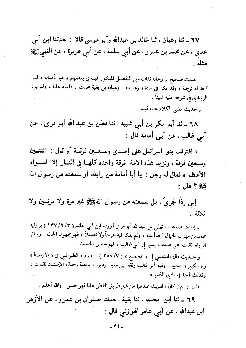 افْتَرَقَتْ بَنُو إِسْرَائِيلَ عَلَى إِحْدَى وَسَبْعِينَ فِرْقَةً أَوْ قَالَ: اثْنَتَيْنِ وَسَبْعِينَ فِرْقَةً وَتَزِيدُ هَذِهِ الأُمَّةُ فِرْقَةً وَاحِدَةً كُلُّهَا فِي النَّارِ إِلا السواد الأعظم لَهُ رَجُلٌ يَا أَبَا أُمَامَةَ مِنْ رَأْيِكَ أَوْ سَمِعْتَهُ مِنْ رَسُولُ اللَّهِ صَلَّى اللَّهُ عَلَيْهِ وسلم؟ قال: