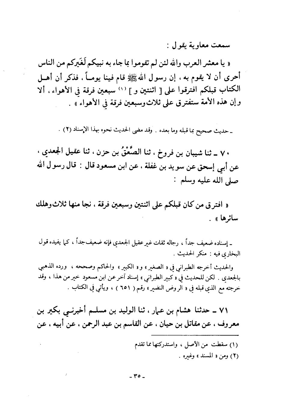 "افْتَرَقَ مَنْ كَانَ قَبْلَكُمْ عَلَى اثْنَتَيْنِ وَسَبْعِينَ فِرْقَةً نَجَا مِنْهَا ثلاث وهلك سائرها".