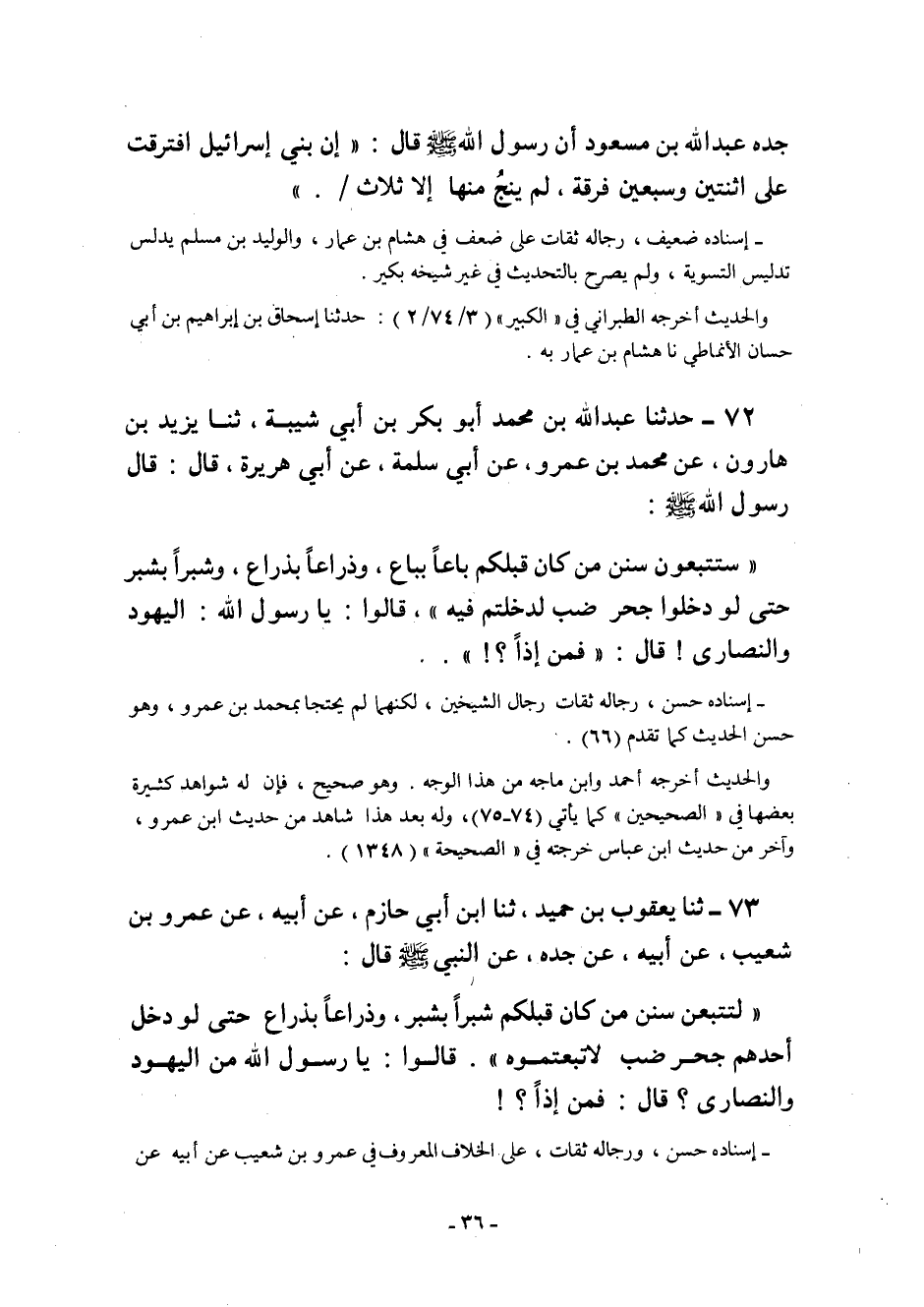 جده عبد الله بْنِ مَسْعُودٍ أَنّ رَسُولَ اللَّهِ صَلَّى اللَّهُ عَلَيْهِ وَسَلَّمَ قَالَ: "إِنَّ بَنِي إِسْرَائِيلَ افْتَرَقَتْ عَلَى اثْنَتَيْنِ وَسَبْعِينَ فِرْقَةً لَمْ يَنْجُ منها إلا ثلاث".