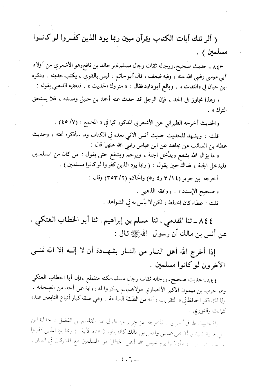 "إِذَا أَخْرَجَ اللَّهُ أَهْلَ النَّارِ مِنَ النَّارِ بِشَهَادَةِ أَنْ لا إِلَهَ إِلا اللَّهُ تَمَنَّى الآخَرُونَ لَوْ كَانُوا مُسْلِمِينَ". حديث صحيح ورجاله ثقات رجال مسلم لكنه منقطع فإن أبا الخطاب العتكي وهو حرب بن ميمون الأكبر الأنصاري مولاهم لم يذكروا له رواية عن أحد من الصحابة ولذلك ذكر الحافظ في التقريب أنه من الطبقة السابعة وهي طبقة كبار أتباع التابعين عنده كمالك والثوري.