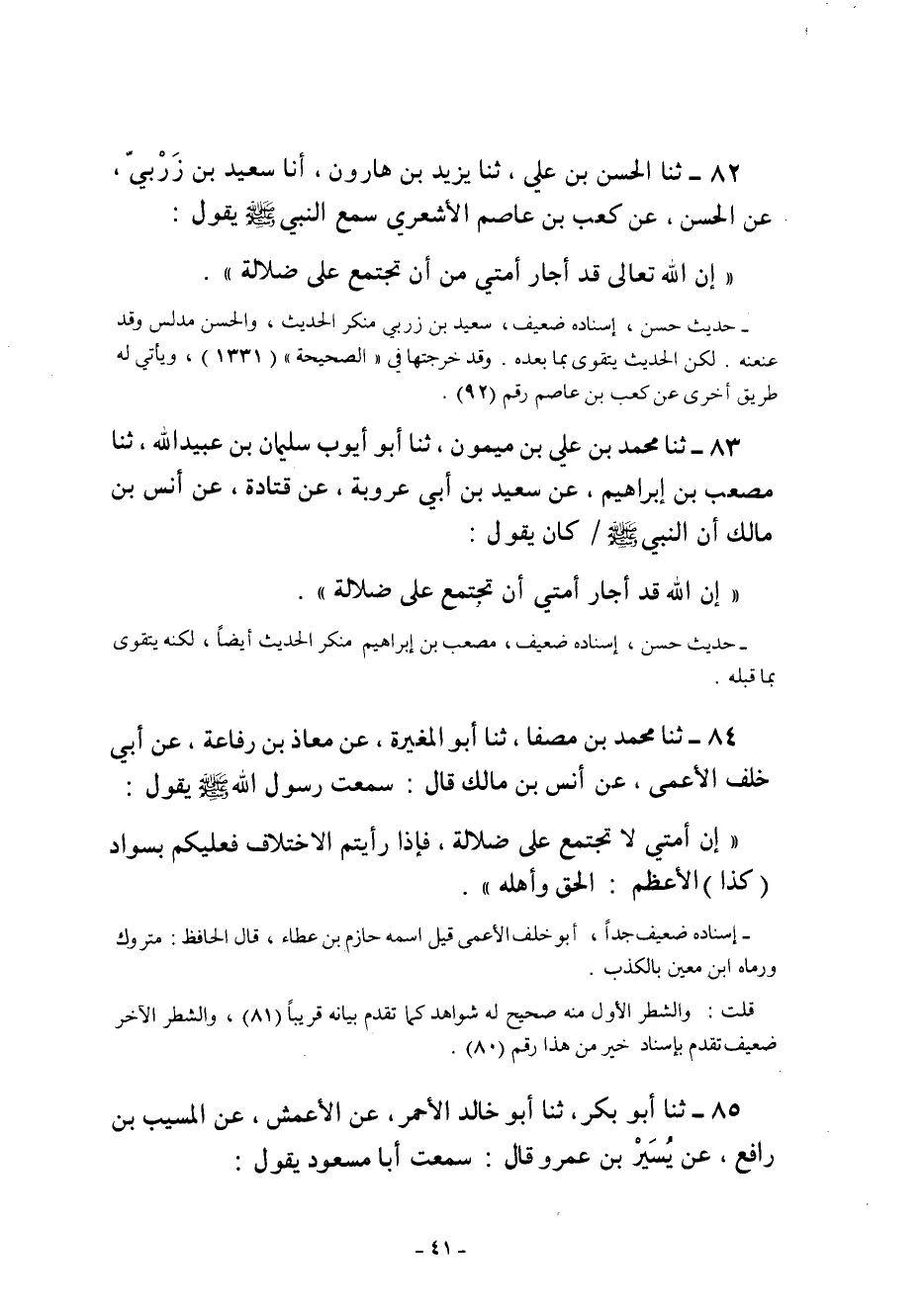"إِنَّ أُمَّتِي لا تَجْتَمِعُ عَلَى ضَلالَةٍ فَإِذَا رَأَيْتُمُ الاخْتِلافَ فَعَلَيْكُمْ بِسَوَادِ "كذا" الأعظم: الحق وأهله".
