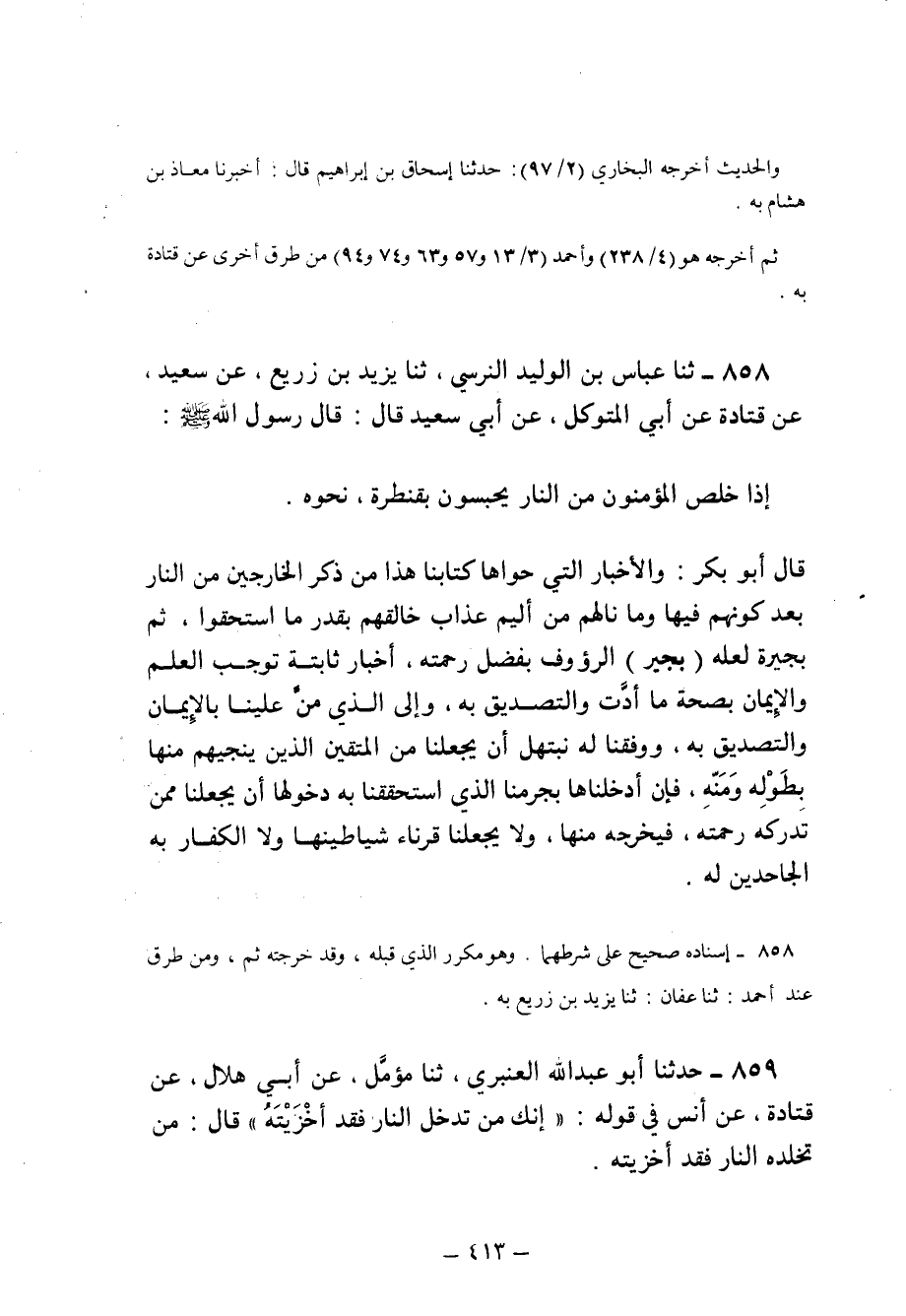 858 - ثنا عَبَّاسُ بْنُ الْوَلِيدِ النَّرْسِيُّ ثنا يَزِيدُ بْنُ زُرَيْعٍ عَنِ سَعِيدٌ عَنْ قَتَادَةَ عَنْ أَبِي الْمُتَوَكِّلِ عَنْ أَبِي سَعِيدٍ قَالَ: قَالَ رَسُولُ اللَّهِ صَلَّى اللَّهُ عَلَيْهِ وَسَلَّمَ:
