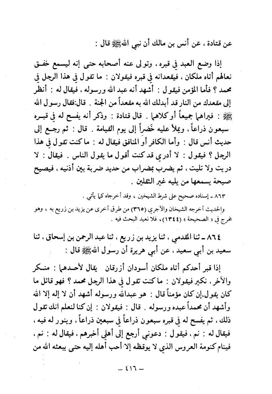 "إِذَا وُضِعَ الْعَبْدُ فِي قَبْرِهِ وَتَوَلَّى عَنْهُ أَصْحَابُهُ حَتَّى إِنَّهُ لَيَسْمَعُ خَفْقَ نِعَالِهِمْ أَتَاهُ مَلَكَانِ فَيُقْعِدَانِهِ فِي قَبْرِهِ فَيَقُولانِ مَا تَقُولُ فِي هَذَا الرَّجُلِ فِي مُحَمَّدٍ فَأَمَّا الْمُؤْمِنُ فَيَقُولُ أَشْهَدُ أَنَّهُ عبد الله وَرَسُولُهُ فَيُقَالُ لَهُ انْظُرْ إِلَى مَقْعَدِكَ مِنَ النَّارِ قَدْ أَبْدَلَكَ اللَّهُ بِهِ مَقْعَدًا مِنَ الْجَنَّةِ" قَالَ فَقَالَ رَسُولُ اللَّهِ صَلَّى اللَّهُ عَلَيْهِ وَسَلَّمَ: "فَيَرَاهُمَا جَمِيعًا أَوْ كِلاهُمَا". قَالَ قَتَادَةُ: وَذَكَرَ أنه يفسخ لَهُ فِي قَبْرِهِ سَبْعُونَ ذِرَاعًا وَيُمْلأُ عَلَيْهِ خَضِرًا إِلَى يَوْمِ الْقِيَامَةِ قَالَ ثُمَّ رَجَعَ إِلَى حَدِيثِ أَنَسٍ قَالَ: "وَأَمَّا الْكَافِرُ أَوِ الْمُنَافِقُ فَيُقَالُ لَهُ مَا كُنْتَ تَقُولُ فِي هَذَا الرَّجُلِ فَيَقُولُ لا أَدْرِي قَدْ كُنْتُ أَقُولُ مَا يَقُولُ النَّاسُ فَيُقَالُ لا دَرَيْتَ وَلا تَلَيْتَ ثُمَّ يُضْرَبُ بِمِضْرَابٍ مِنْ حَدِيدٍ ضَرْبَةً بَيْنَ أُذُنَيْهِ فَيَصِيحُ صَيْحَةً يَسْمَعُهَا من يليه غير الثقلين".