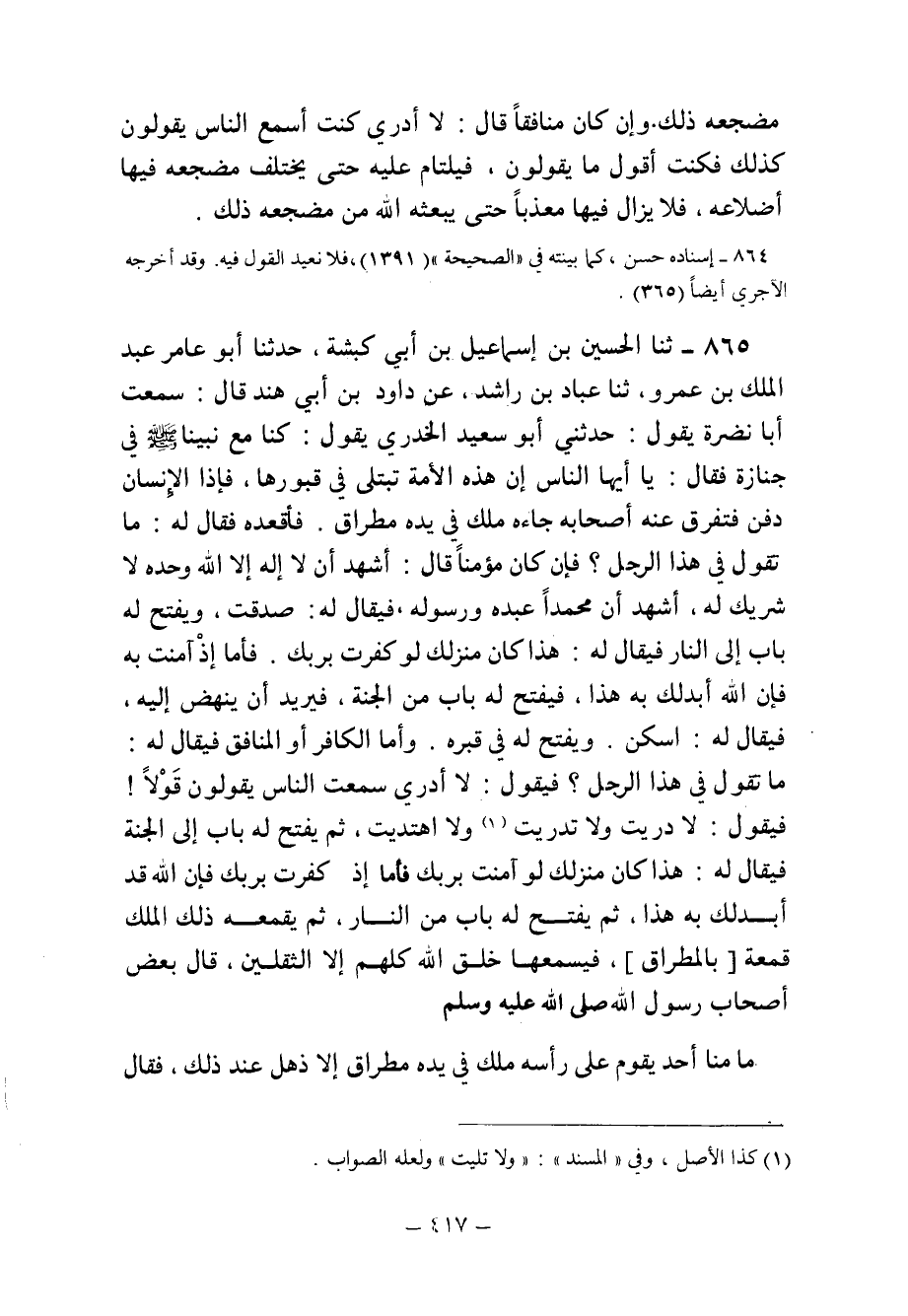 865 - ثنا الْحُسَيْنُ بْنُ إِسْمَاعِيلَ بْنِ أَبِي كَبْشَةَ حَدَّثَنَا أَبُو عَامِرٍ عَبْدُ الْمَلِكِ بْنُ عَمْرٍو ثنا عَبَّادُ بْنُ رَاشِدٍ عَنْ دَاوُدَ بْنِ أَبِي هِنْدَ قَالَ: سَمِعْتُ أَبَا نَضْرَةَ يَقُولُ: حَدَّثَنِي أَبُو سَعِيدٍ الْخُدْرِيِّ يَقُولُ: كُنَّا مَعَ نَبِيِّنَا صَلَّى اللَّهُ عَلَيْهِ وَسَلَّمَ فِي جَنَازَةٍ فَقَالَ: "يَا أَيُّهَا النَّاسُ إِنَّ هَذِهِ الأُمَّةَ تُبْتَلَى فِي قُبُورِهَا فَإِذَا الإِنْسَانُ دُفِنَ فَتَفَرَّقَ عَنْهُ أَصْحَابُهُ جَاءَهُ مَلَكٌ فِي يَدِهِ مِطْرَاقٌ فَأَقْعَدَهُ فَقَالَ لَهُ مَا تَقُولُ فِي هَذَا الرَّجُلِ فَإِنْ كَانَ مُؤْمِنًا قَالَ أَشْهَدُ أَنْ لا إِلَهَ إِلا اللَّهُ وَحْدَهُ لا شَرِيكَ لَهُ أَشْهَدُ أَنَّ مُحَمَّدًا عَبْدُهُ وَرَسُولُهُ فَيُقَالُ لَهُ: صَدَقْتَ وَيُفْتَحُ لَهُ بَابٌ إِلَى النَّارِ فَيُقَالُ لَهُ هَذَا كَانَ مَنْزِلَكَ لَوْ كَفَرْتَ بِرَبِّكَ فَأَمَّا إذْ آمَنْتَ بِهِ فَإِنَّ اللَّهَ أَبْدَلَكَ بِهِ هَذَا فَيُفْتَحُ لَهُ بَابٌ مِنَ الْجَنَّةِ فَيُرِيدُ أَنْ يَنْهَضَ إِلَيْهِ فَيُقَالُ لَهُ اسْكُنْ وَيُفْتَحُ لَهُ فِي قَبْرِهِ. وَأَمَّا الْكَافِرُ أَوِ الْمُنَافِقُ فَيُقَالُ لَهُ: مَا تَقُولُ فِي هَذَا الرَّجُلِ فَيَقُولُ لا أَدْرِي سَمِعْتُ النَّاسَ يَقُولُونَ قَوْلا فَيَقُولُ لا دريت ولا تدريت 1 وَلا اهْتَدَيْتَ ثُمَّ يُفْتَحُ لَهُ بَابٌ إِلَى الْجَنَّةِ فَيُقَالُ لَهُ هَذَا كَانَ مَنْزِلَكَ لَوْ آمَنْتَ بِرَبِّكَ فَأَمَّا إِذْ كَفَرْتَ بِرَبِّكَ فَإِنَّ اللَّهَ قَدْ أَبْدَلَكَ بِهِ هَذَا ثُمَّ يُفْتَحُ لَهُ بَابٌ مِنَ النَّارِ ثُمَّ يَقْمَعُهُ ذَلِكَ الْمَلَكُ قَمَعَةً بِالْمِطْرَاقِ فَيَسْمَعُهَا خَلْقُ اللَّهِ كُلُّهُمْ إِلا الثَّقَلَيْنِ". قَالَ بَعْضُ أَصْحَابِ رَسُولِ اللَّهِ صَلَّى اللَّهُ عَلَيْهِ وَسَلَّمَ: