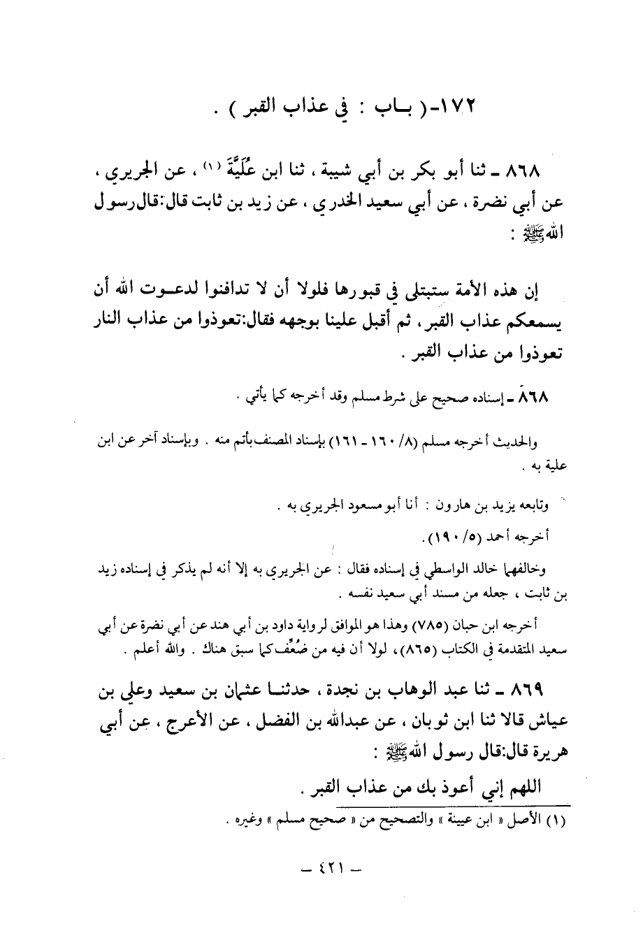 "إِنَّ هَذِهِ الأُمَّةَ سَتُبْتَلَى فِي قُبُورِهَا فَلَوْلا أَنْ لا تَدَافَنُوا لَدَعَوْتُ اللَّهَ أَنْ يُسْمِعَكُمْ عَذَابَ الْقَبْرِ ثُمَّ أَقْبَلَ عَلَيْنَا بِوَجْهِهِ فَقَالَ تَعَوَّذُوا مِنْ عَذَابِ النَّارِ تَعَوَّذُوا من عذاب القبر".