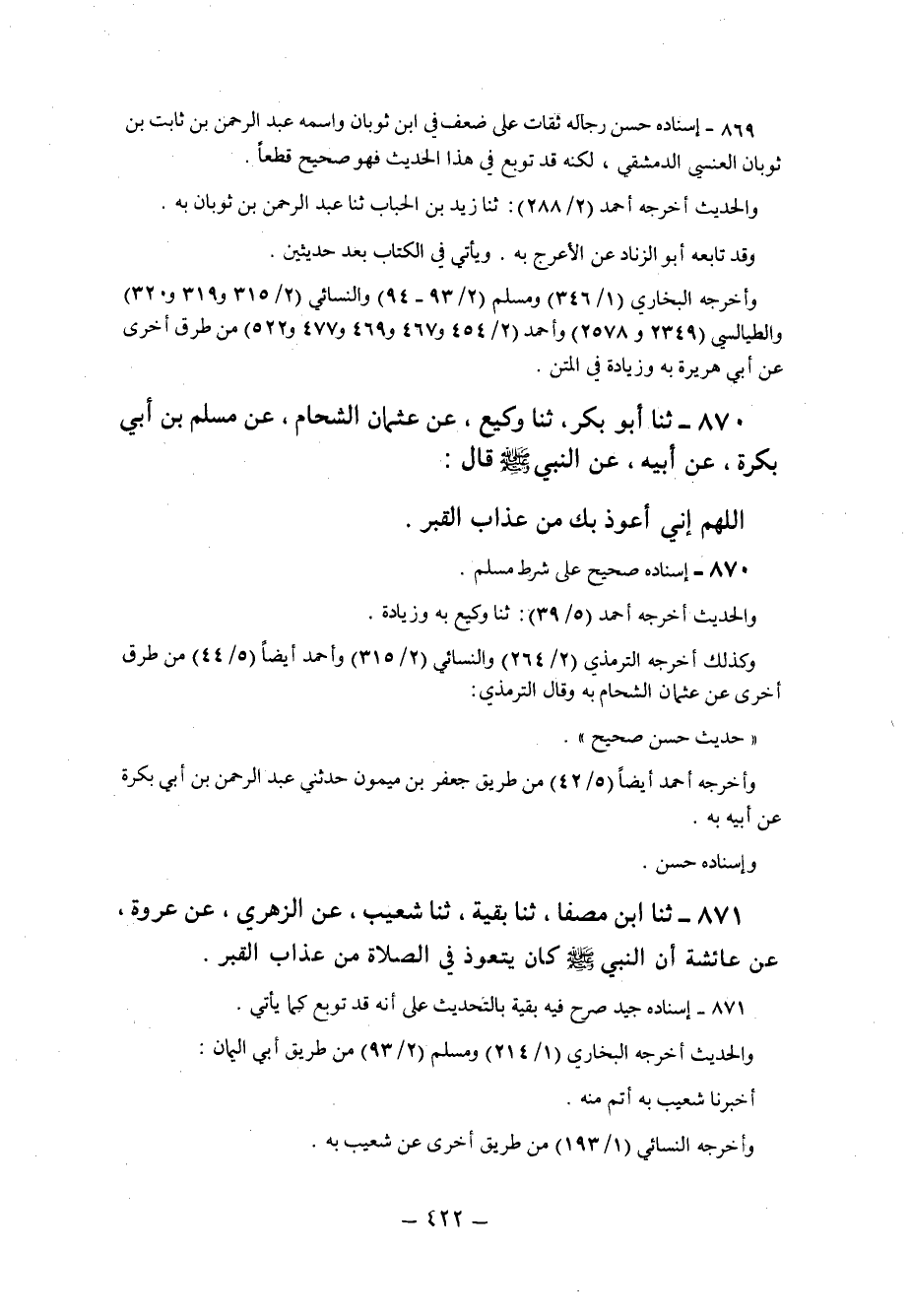 871 - ثنا ابن مصفا ثنا بَقِيَّةُ ثنا شُعَيْبٌ عَنِ الزُّهْرِيِّ عَنْ عُرْوَةَ عَنْ عَائِشَةَ أَنّ النَّبِيَّ صَلَّى اللَّهُ عَلَيْهِ وَسَلَّمَ كَانَ يَتَعَوَّذُ فِي الصَّلاةِ من عذاب القبر.