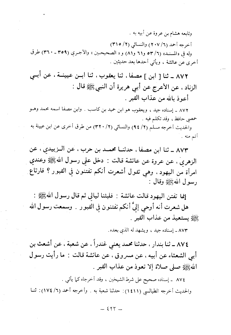 872 - ثنا ابن مصفا ثنا يَعْقُوبُ ثنا ابْنُ عُيَيْنَةَ عَنْ أَبِي الزِّنَادِ عَنِ الأَعْرَجِ عَنْ أَبِي هُرَيْرَةَ أَنّ النَّبِيَّ صَلَّى اللَّهُ عَلَيْهِ وَسَلَّمَ قَالَ: "أَعُوذُ بِاللَّهِ مِنْ عَذَابِ الْقَبْرِ".