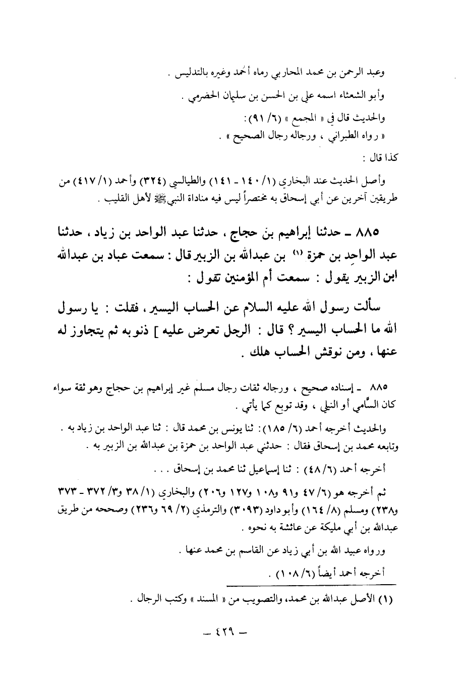 885 - حَدَّثَنَا إِبْرَاهِيمُ بْنُ حَجَّاجٍ حَدَّثَنَا عَبْدُ الْوَاحِدِ بْنُ زِيَادٍ حَدَّثَنَا عَبْدُ الْوَاحِدِ بْنُ حَمْزَةَ1 بْنِ عبد الله بْنِ الزُّبَيْرِ قَالَ سَمِعْتُ عَبَّادَ بن عبد الله ابن الزُّبَيْرِ يَقُولُ سَمِعْتُ أُمَّ الْمُؤْمِنِينَ تَقُولُ: