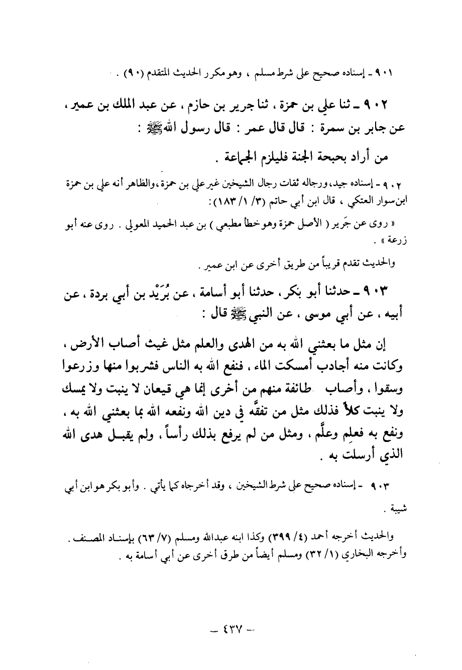 902 - ثنا عَلِيُّ بْنُ حَمْزَةَ ثنا جرير بن حازم عن عبد الملك بْنِ عُمَيْرٍ عَنْ جَابِرِ بْنِ سَمُرَةَ قَالَ: قَالَ عُمَرُ قَالَ رَسُولُ اللَّهِ صَلَّى اللَّهُ عَلَيْهِ وَسَلَّمَ: