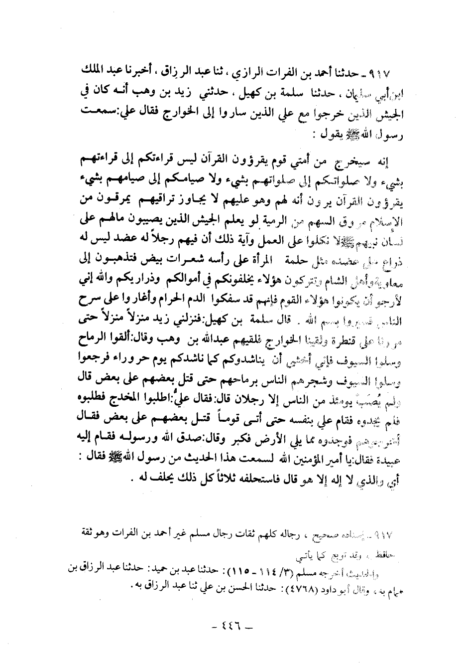 917 - حَدَّثَنَا أَحْمَدُ بْنُ الْفُرَاتِ الرَّازِيُّ ثنا عَبْدُ الرَّزَّاقِ أَخْبَرَنَا عَبْدُ الملك ابن أَبِي سُلَيْمَانَ حَدَّثَنَا سَلَمَةُ بْنُ كُهَيْلٍ حَدَّثَنِي زَيْدُ بْنُ وَهْبٍ أَنَّهُ كَانَ فِي الْجَيْشِ الَّذِينَ خَرَجُوا مَعَ عَلِيٍّ الَّذِينَ سَارُوا إِلَى الْخَوَارِجِ فَقَالَ عَلِيٌّ: سَمِعْتُ رَسُولُ اللَّهِ صَلَّى اللَّهُ عَلَيْهِ وَسَلَّمَ يَقُولُ: