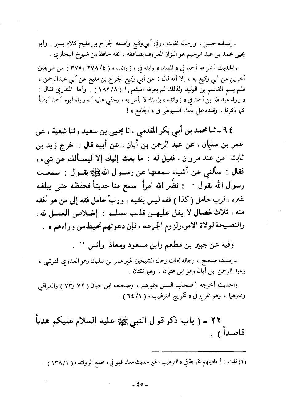 94- ثنا مُحَمَّدُ بْنُ أَبِي بَكْرٍ الْمُقَدَّمِيُّ ثنا يَحْيَى بْنُ سَعِيدٍ ثنا شُعْبَةُ عَنْ عُمَرَ بْنِ سُلَيْمَانَ عَنْ عَبْدِ الرَّحْمَنِ بْنِ أَبَانَ عَنْ أَبِيهِ قَالَ خَرَجَ زَيْدُ بْنُ ثَابِتٍ مِنْ عِنْدِ مَرْوَانَ فَقِيلَ لَهُ مَا بَعَثَ إليك إلا ليسألك عن شيء فَقَالَ: سَأَلَنِي عَنْ أَشْيَاءَ سَمِعْتُهَا عَنْ رَسُولِ اللَّهِ صَلَّى اللَّهُ عَلَيْهِ وَسَلَّمَ يَقُولُ: سَمِعْتُ رَسُولَ الله يَقُولُ: "نَضَّرَ اللَّهُ امْرَأً سَمِعَ مِنَّا حَدِيثًا فَحَفِظَهُ حَتَّى يُبَلِّغَهُ غيره فرب حامل "كذا" فِقْهٍ لَيْسَ بِفَقِيهٍ وَرَبَّ حَامِلِ فِقْهٍ إِلَى مَنْ هُوَ أَفْقَهُ مِنْهُ ثَلاثُ خِصَالٍ لا يَغِلُّ عَلَيْهِنَّ قَلْبُ مُسْلِمٍ إِخْلاصُ الْعَمَلِ لِلَّهِ وَالنَّصِيحَةُ لِوُلاةِ الأَمْرِ وَلُزُومُ الْجَمَاعَةِ فَإِنَّ دَعْوَتَهُمْ تُحِيطُ مِنْ وراءهم".
