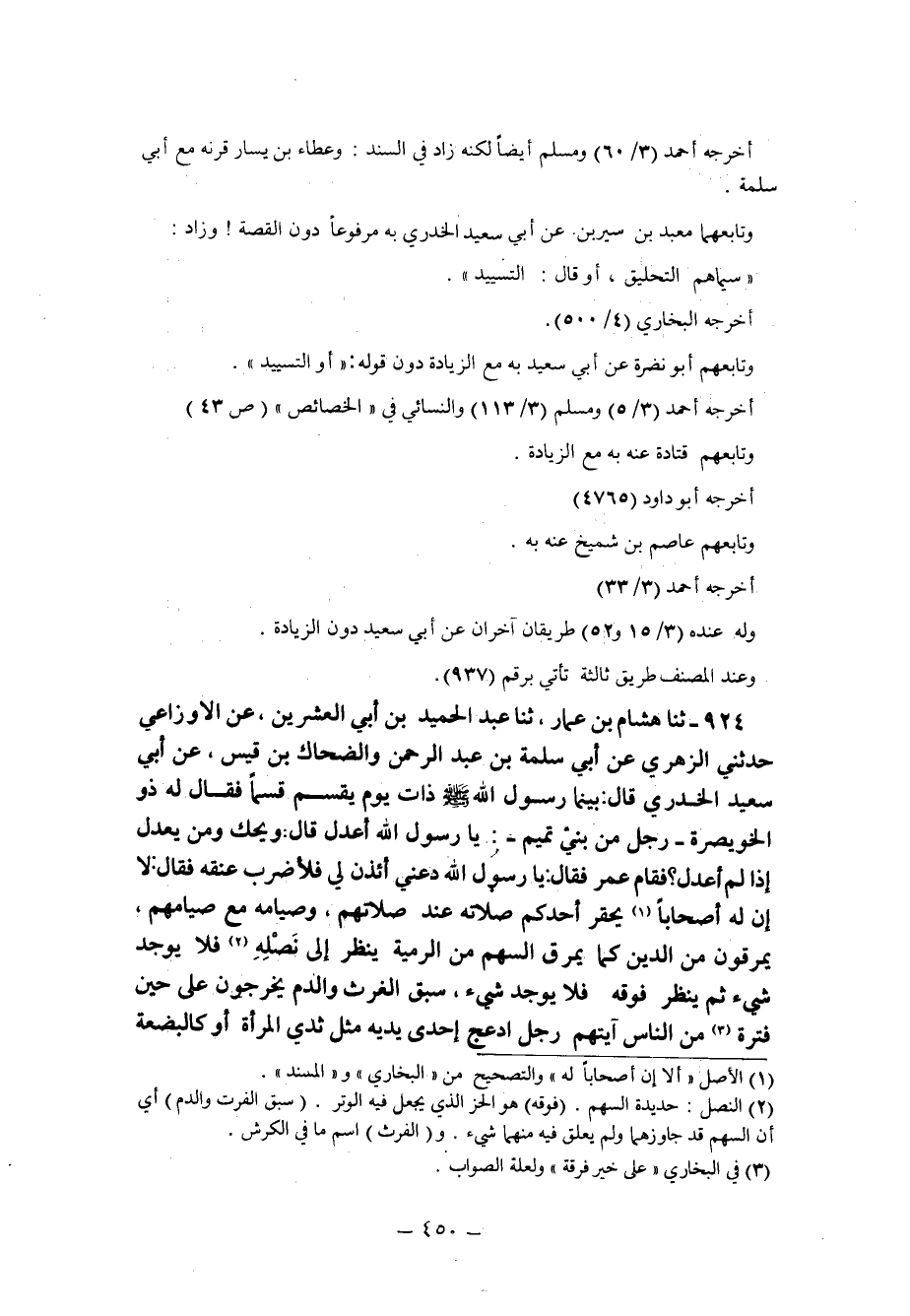 924 - ثنا هِشَامُ بْنُ عَمَّارٍ ثنا عَبْدُ الْحَمِيدِ بْنُ أَبِي الْعِشْرِينَ عَنِ الأَوْزَاعِيِّ حَدَّثَنِي الزُّهْرِيُّ عَنْ أَبِي سَلَمَةَ بْنِ عَبْدِ الرَّحْمَنِ وَالضَّحَّاكِ بْنِ قَيْسٍ عَنْ أَبِي سَعِيدٍ الْخُدْرِيِّ قَالَ: بَيْنَمَا رَسُولُ اللَّهِ صَلَّى اللَّهُ عَلَيْهِ وَسَلَّمَ ذَاتَ يَوْمٍ يَقْسِمُ قَسْمًا فَقَالَ لَهُ ذُو الْخُوَيْصِرَةِ رَجُلٌ مِنْ بَنِي تَمِيمٍ يَا رَسُولَ اللَّهِ اعْدِلْ قَالَ: "وَيْحَكَ وَمَنْ يَعْدِلُ إِذَا لَمْ أَعْدِلْ". فَقَامَ عُمَرُ فَقَالَ: يَا رَسُولَ اللَّهِ دَعْنِي ائْذَنْ لِي فَلأَضْرِبَ عُنُقَهُ. فَقَالَ: "لا إِنَّ لَهُ أَصْحَابًا1 يَحْقِرُ أَحَدُكُمْ صَلاتَهُ عِنْدَ صَلاتِهِمْ وَصِيَامَهُ مَعَ صِيَامِهِمْ يَمْرُقُونَ مِنَ الدِّينِ كَمَا يَمْرُقُ السَّهْمُ مِنَ الرَّمِيَّةِ يَنْظُرُ إِلَى نَصْلِهِ 2 فَلا يُوجَدُ شَيْءٌ ثُمَّ يَنْظُرُ فَوْقَهُ فَلا يُوجَدُ شَيْءٌ سَبَقَ الْفَرْثَ وَالدَّمَ يَخْرُجُونَ عَلَى حِينِ فَتْرَةٍ 3 مِنَ النَّاسِ آيَتُهُمْ رَجُلٌ أَدْعَجُ إِحْدَى يَدَيْهِ مِثْلُ ثَدْيِ الْمَرْأَةِ أَوْ كالبضعة