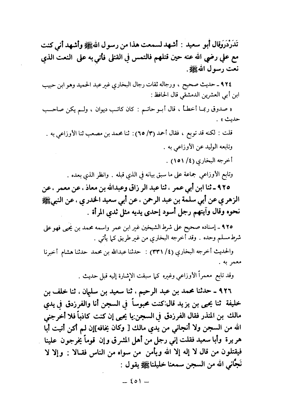 925 - ثنا ابْنُ أَبِي عُمَرَ ثنا عَبْدُ الرَّزَّاقِ وَعَبْدُ اللَّهِ بْنُ مُعَاذٍ عَنْ مَعْمَرٍ عَنِ الزُّهْرِيِّ عَنْ أَبِي سَلَمَةَ بْنِ عَبْدِ الرَّحْمَنِ عَنْ أَبِي سَعِيدٍ الْخُدْرِيِّ عَنِ النَّبِيِّ صَلَّى اللَّهُ عَلَيْهِ وسلم نحوه. وقال: "وَآيَتُهُمْ رَجُلٌ أَسْوَدُ إِحْدَى يَدَيْهِ مثل ثدي المرأة".