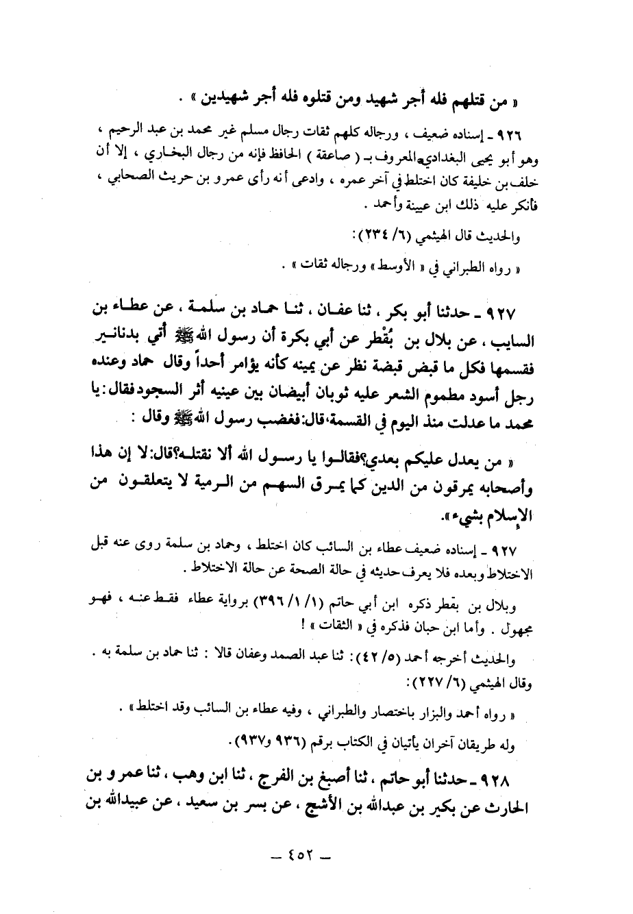927 - حَدَّثَنَا أَبُو بَكْرٍ ثنا عَفَّانُ ثنا حَمَّادُ بْنُ سَلَمَةَ عَنْ عطاء بن السايب عَنْ بِلالِ بْنِ بُقْطُرٍ عَنْ أَبِي بَكْرَةَ أَنّ رَسُولَ اللَّهِ صَلَّى اللَّهُ عَلَيْهِ وَسَلَّمَ: أَتَى بدنانير فقسمها فكل ما قَبَضَ قَبْضَةً نَظَرَ عَنْ يَمِينِهِ كَأَنَّهُ يُؤَامِرُ أَحَدًا. وَقَالَ حَمَّادٌ وَعِنْدَهُ رَجُلٌ أَسْوَدُ مَطْمُومُ الشَّعْرِ عَلَيْهِ ثَوْبَانِ أَبْيَضَانِ بَيْنَ عَيْنَيْهِ أَثَرُ السُّجُودِ فَقَالَ يَا مُحَمَّدُ مَا عَدَلْتَ مُنْذُ الْيَوْمِ فِي الْقِسْمَةِ. قَالَ فَغَضِبَ رَسُولُ اللَّهِ صَلَّى اللَّهُ عَلَيْهِ وَسَلَّمَ وَقَالَ: