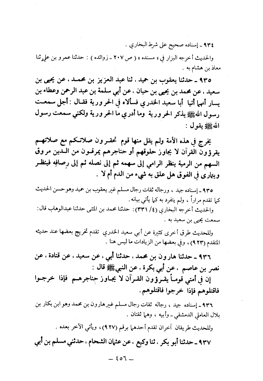 935 - حَدَّثَنَا يَعْقُوبُ بْنُ حُمَيْدٍ ثنا عَبْدُ الْعَزِيزِ بْنُ مُحَمَّدٍ عَنْ يَحْيَى بْنُ سَعِيدٍ عَنْ مُحَمَّدِ بن يحيى بن حيان عَنْ أَبِي سَلَمَةَ بْنِ عَبْدِ الرَّحْمَنِ وعَطَاءِ بْنِ يَسَارٍ أنهما أتيا أبا سعيد الخدري فسألاه في الحرورية فقال: أجل سمعت رَسُولُ اللَّهِ صَلَّى اللَّهُ عَلَيْهِ وَسَلَّمَ يَذْكُرُ الْحَرُورِيَّةَ وَمَا أَدْرِي مَا الْحَرُورِيَّةُ وَلَكِنِّي سَمِعْتُ رَسُولَ اللَّهِ صَلَّى اللَّهُ عَلَيْهِ وَسَلَّمَ يَقُولُ: