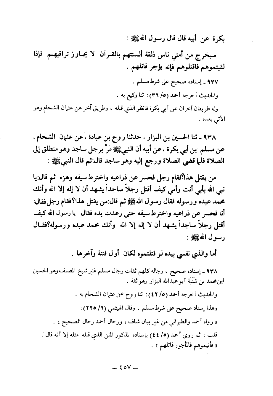 938 - ثنا الْحُسَيْنُ بْنُ الْبَزَّارِ حَدَّثَنَا رَوْحُ بْنُ عُبَادَةَ عَنْ عُثْمَانَ الشَّحَّامِ عَنْ مُسْلِمِ بْنِ أَبِي بَكْرَةَ عَنْ أَبِيهِ أَنّ النَّبِيَّ صَلَّى اللَّهُ عَلَيْهِ وَسَلَّمَ مَرَّ بِرَجُلٍ سَاجِدٍ وَهُوَ مُنْطَلِقٌ إِلَى الصَّلاةِ فَلَمَّا قَضَى الصَّلاةَ وَرَجَعَ إليه وهو ساجد قال ثم قَالَ النَّبِيُّ صَلَّى اللَّهُ عَلَيْهِ وسلم: "مَنْ يَقْتُلُ هَذَا". فَقَامَ رَجُلٌ فَحَسَرَ عَنْ ذِرَاعَيْهِ وَاخْتَرَطَ سَيْفَهُ وَهَزَّهُ ثُمَّ قَالَ يَا نَبِيَّ اللَّهِ بِأَبِي أَنْتَ وَأُمِّي كَيْفَ أَقْتُلُ رَجُلا سَاجِدًا يَشْهَدُ أَنْ لا إِلَهَ إِلا اللَّهُ وَأَنَّكَ مُحَمَّدٌ عَبْدُهُ وَرَسُولُهُ فَقَالَ رَسُولُ اللَّهِ صَلَّى اللَّهُ عَلَيْهِ وَسَلَّمَ: "ثُمَّ قَالَ مَنْ يَقْتُلُ هَذَا" فَقَامَ رَجُلٌ فَقَالَ أَنَا فَحَسَرَ عَنْ ذِرَاعَيْهِ وَاخْتَرَطَ سَيْفَهُ حَتَّى رَعَدَتْ يَدُهُ فَقَالَ يَا رَسُولَ اللَّهِ كَيْفَ أَقْتُلُ رَجُلا سَاجِدًا يَشْهَدُ أَنْ لا إِلَهَ إِلا اللَّهُ وَأَنَّكَ مُحَمَّدٌ عَبْدُهُ وَرَسُولُهُ فَقَالَ رَسُولُ اللَّهِ صَلَّى اللَّهُ عَلَيْهِ وَسَلَّمَ:
