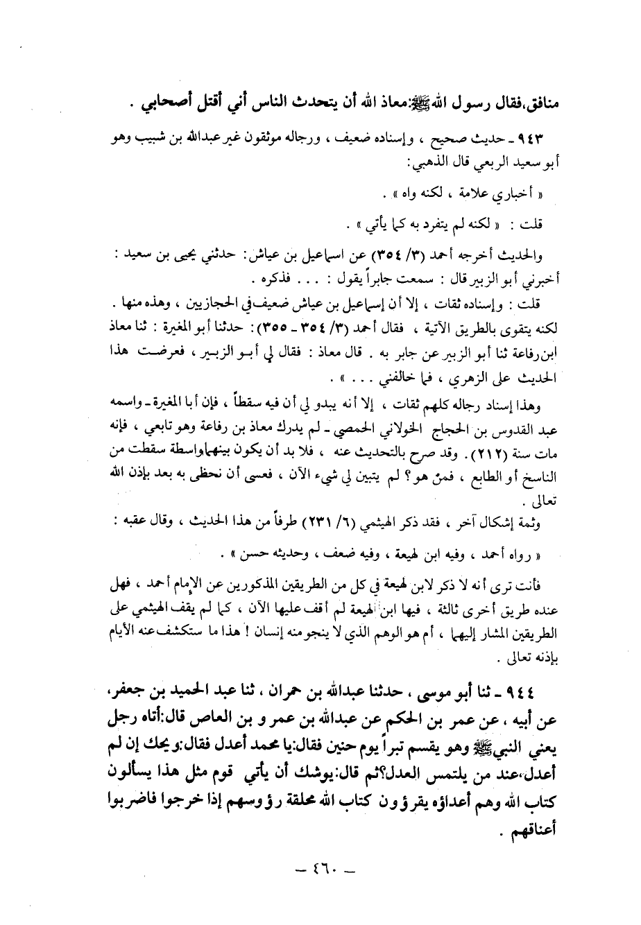 وهذا إسناد رجاله كلهم ثقات إلا أنه يبدوا لي أن فيه سقطا فإن أبا المغيرة واسمه عبد القدوس بن الحجاج الخولاني الحمصي لم يدرك معاذ بن رفاعة وهو تابعي فإنه مات سنة 212. وقد صرح بالتحديث عنه فلا بد أن يكون بينهما واسطة سقطت من الناسخ أو الطابع فمن هو لم يتبين لي شيء الآن فعسى أن نحظى به بعد بإذن الله تعالى.
