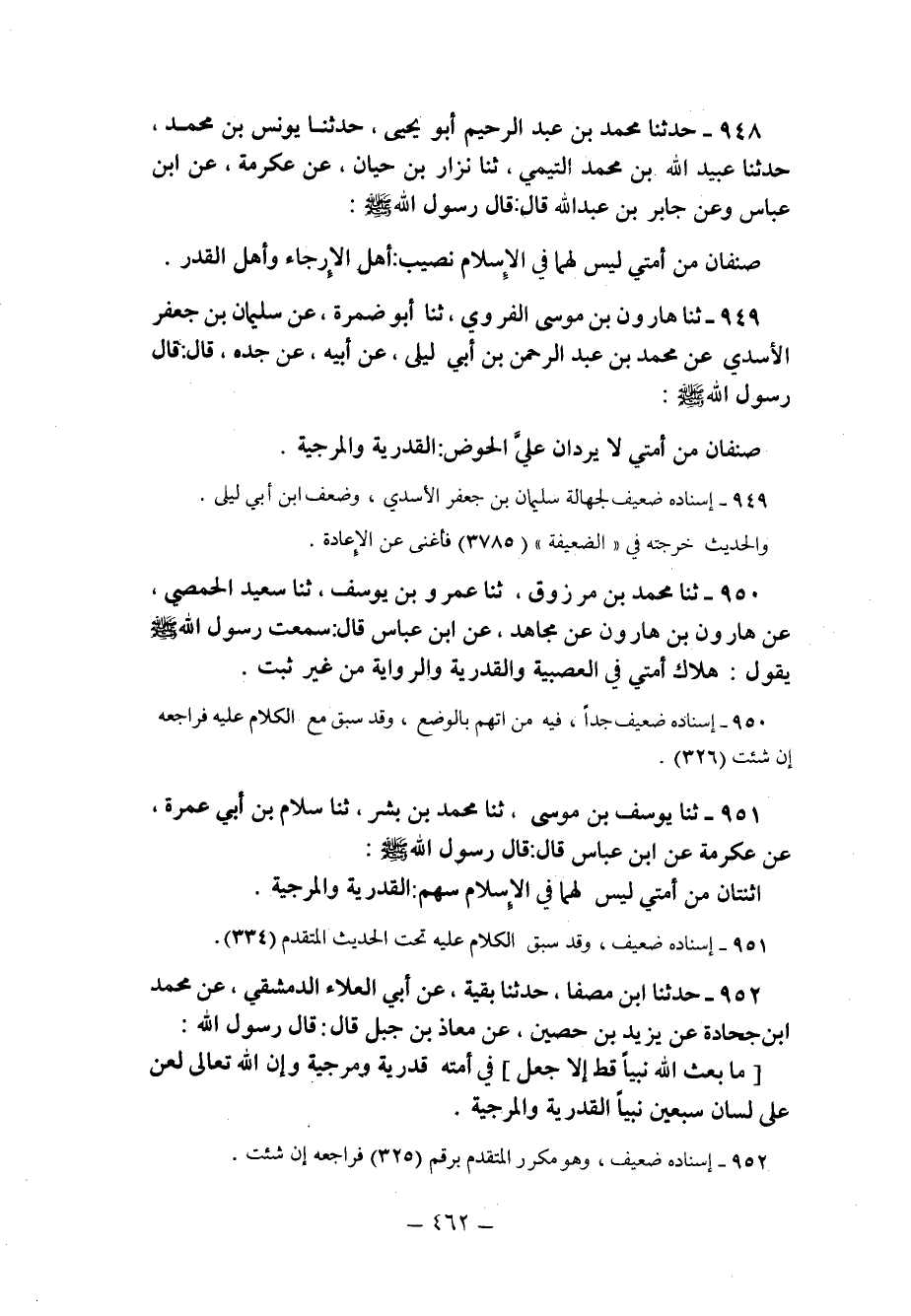 950 - ثنا مُحَمَّدُ بْنُ مَرْزُوقٍ ثنا عَمْرُو بْنُ يُوسُفَ ثنا سَعِيدٌ الْحِمْصِيِّ عَنْ هَارُونَ بْنِ هَارُونَ عَنْ مُجَاهِدٍ عَنِ ابْنِ عَبَّاسٍ قَالَ: سَمِعْتُ رَسُولَ اللَّهِ صَلَّى اللَّهُ عَلَيْهِ وَسَلَّمَ يَقُولُ: "هَلاكُ أُمَّتِي فِي الْعَصَبِيَّةِ وَالْقَدَرِيَّةِ". وَالرِّوَايَةِ من غير ثبت.