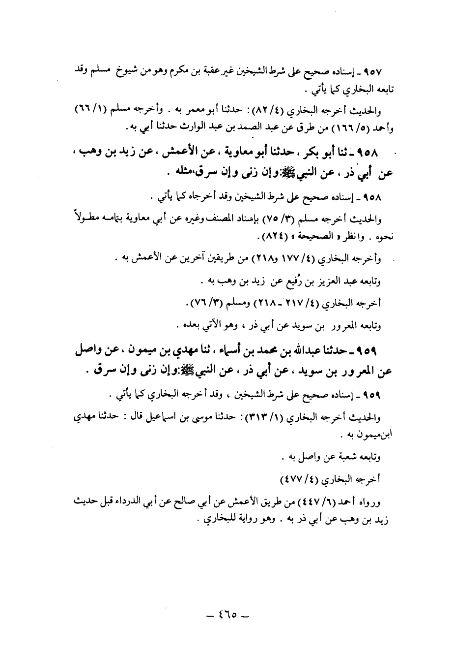 958 - ثنا أَبُو بَكْرٍ حَدَّثَنَا أَبُو مُعَاوِيَةَ عَنِ الأَعْمَشِ عَنْ زَيْدِ بْنِ وَهْبٍ عَنْ أَبِي ذَرٍّ عَنِ النَّبِيِّ صَلَّى اللَّهُ عَلَيْهِ وَسَلَّمَ: "وَإِنْ زَنَى وَإِنْ سَرَقَ" مثله.