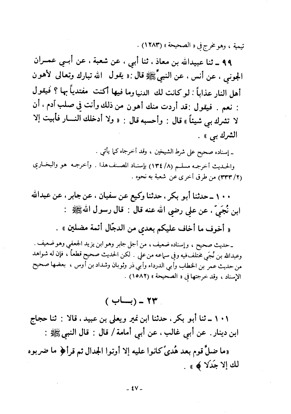 99- ثنا عبيد الله بْنُ مُعَاذٍ ثنا أَبِي عَنْ شُعْبَةَ عَنْ أَبِي عِمْرَانَ الْجَوْنِيِّ عَنْ أَنَسٍ عَنِ النَّبِيِّ صَلَّى اللَّهُ عَلَيْهِ وَسَلَّمَ قَالَ: "يَقُولُ اللَّهُ تَبَارَكَ وَتَعَالَى لأَهْوَنِ أَهْلِ النَّارِ عَذَابًا لَوْ كَانَتْ لَكَ الدُّنْيَا وَمَا فِيهَا أَكُنْتَ مُفْتَدِيًا بِهَا؟ فَيَقُولُ: نَعَمْ. فَيَقُولُ: قَدْ أَرَدْتُ مِنْكَ أَهْوَنَ مِنْ ذَلِكَ وَأَنْتَ فِي صُلْبِ آدَمَ أَنْ لا تُشْرِكَ بِي شَيْئًا" قَالَ: وَأَحْسَبُهُ قَالَ: "وَلا أُدْخِلُكَ النَّارَ فأبيت إلا الشرك بي".