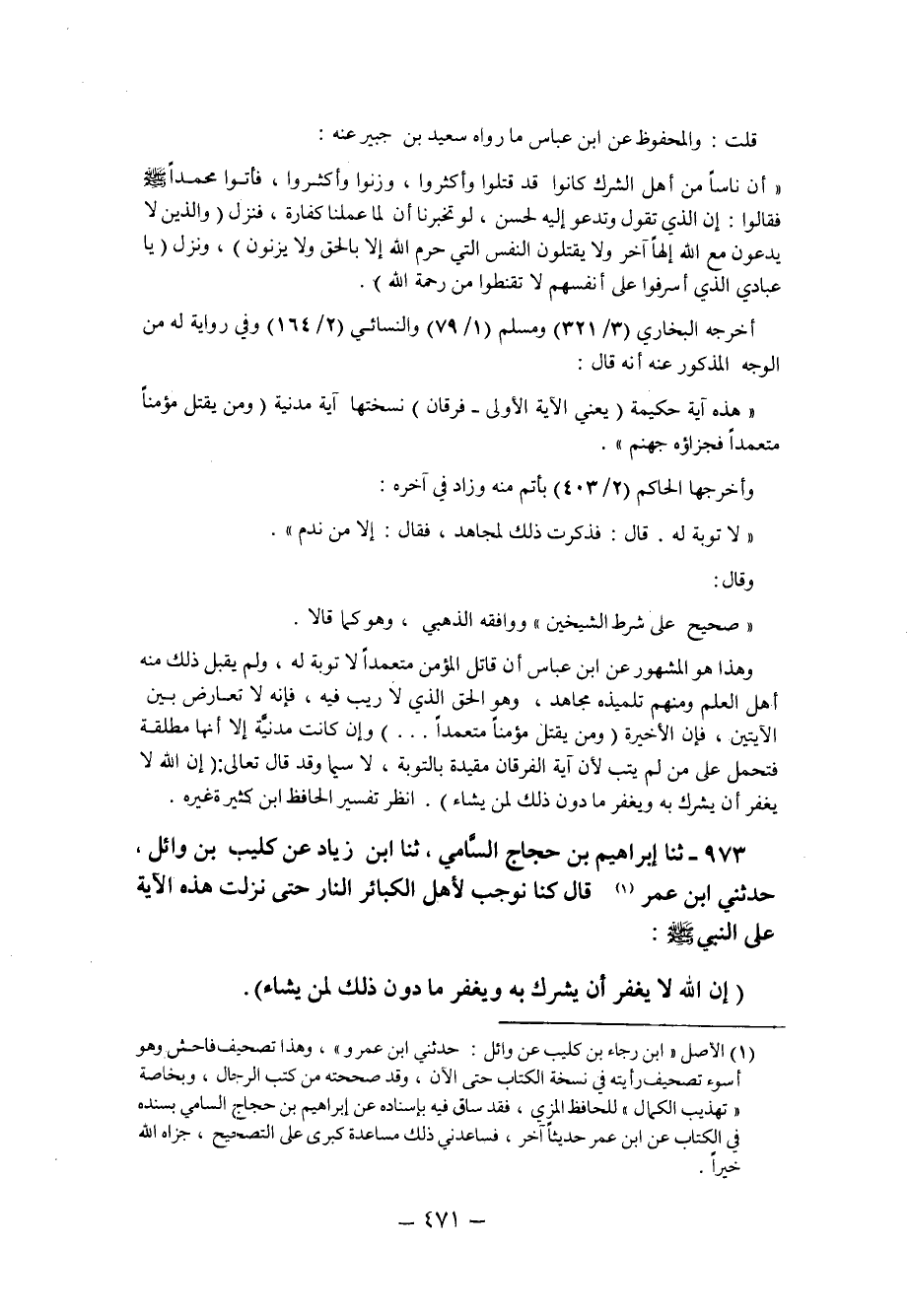 973 - ثنا إِبْرَاهِيمُ بْنُ حَجَّاجٍ السَّامِيُّ ثنا ابْنُ زِيَادٍ عَنْ كُلَيْبِ بْنِ وَائِلٍ حَدَّثَنِي ابْنُ عُمَرَ1 قَالَ: كُنَّا نُوجِبُ لأَهْلِ الْكَبَائِرِ النَّارَ حَتَّى نَزَلَتْ هَذِهِ الآيَةُ عَلَى النَّبِيِّ صَلَّى اللَّهُ عَلَيْهِ وَسَلَّمَ: