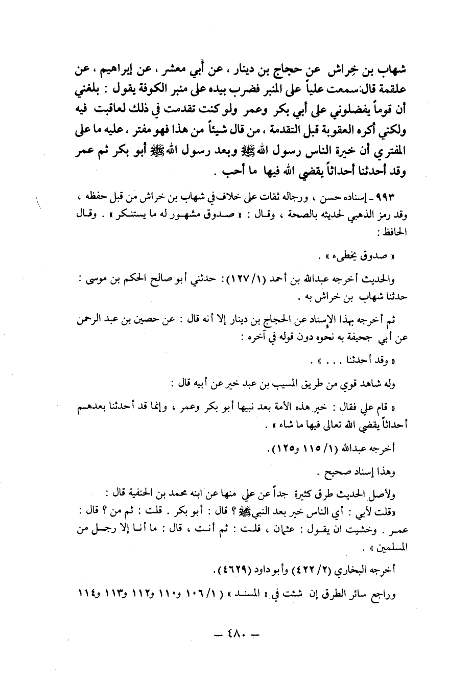 شِهَابُ بْنُ خِرَاشٍ عَنْ حَجَّاجِ بْنِ دِينَارٍ عَنْ أَبِي مَعْشَرٍ عَنْ إِبْرَاهِيمَ عَنْ عَلْقَمَةَ قَالَ: سَمِعْتُ عَلِيًّا عَلَى الْمِنْبَرِ فَضَرَبَ بِيَدِهِ عَلَى مِنْبَرِ الْكُوفَةِ يَقُولُ: بَلَغَنِي أَنَّ قَوْمًا يُفَضِّلُونِي عَلَى أَبِي بَكْرٍ وَعُمَرَ وَلَوْ كُنْتُ تُقِدِّمْتُ فِي ذَلِكَ لَعَاقَبْتُ فِيهِ وَلَكِنِّي أَكْرَهُ الْعُقُوبَةَ قَبْلَ التَّقْدِمَةِ مَنْ قَالَ شَيْئًا مِنْ هَذَا فَهُوَ مُفْتَرٍ عَلَيْهِ مَا عَلَى الْمُفْتَرِي إِنَّ خِيَرَةَ النَّاسِ رَسُولُ اللَّهِ صَلَّى اللَّهُ عَلَيْهِ وَسَلَّمَ وَبَعْدَ رَسُولِ اللَّهِ صَلَّى اللَّهُ عَلَيْهِ وَسَلَّمَ أَبُو بَكْرٍ ثُمَّ عُمَرُ وَقَدْ أَحْدَثْنَا أَحْدَاثًا يَقْضِي الله فيها ما أحب.