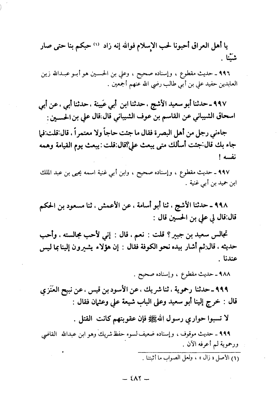 997 - حَدَّثَنَا أَبُو سَعِيدٍ الأَشَجُّ حَدَّثَنَا ابن أبي عيينة حَدَّثَنَا أَبِي عَنْ أَبِي إِسْحَاقَ الشَّيْبَانِيِّ عَنِ الْقَاسِمِ بْنِ عَوْفٍ الشَّيْبَانِيِّ قَالَ: قَالَ عَلِيُّ بْنُ الْحُسَيْنِ: